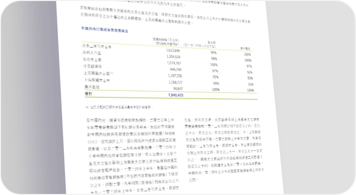 業務評述 ཧਯ ʕʫήʊໝϓཧਯيุଡ଼ΥᐼᅽࠦࠦጐΥމɖϵɞɤຬ̻˙ъdՉʕණྠᏐЦᛆूމʬϵɚɤຬ̻˙ъfɚཧɚ̬ ϋɪ̒ϋdԸІʕʫήཧਯيุٙᏐЦॡږϗɝᐼᕘɪʺϵʱʘɓЇಥ࿆ɚɤʬᄂɓɷʞϵຬʩfৰɛ͏࿆࿆࠽ᜊ ਗdᏐЦॡږϗɝᐼᕘɪʺϵʱʘʞfɚཧɚ̬ϋʬ˜ɧɤ˚dණྠʕʫήʊໝϓཧਯيุП࠽މಥ࿆ʬϵɖɤɖ ᄂཧɓϵຬʩdՉʕණྠᏐЦᛆूމಥ࿆ʞϵʬɤɘᄂɘɷʞϵຬʩf வيุଡ଼Υܼ̍ණྠΌ༟ኹϞٙ̏ԯɧԢˊ˄̚Ԣeϓே˄̚Ԣʿᄿψ䁩ѥeܵϞϵʱʘɘɤɖᛆूٙᄿψ˄̚䁩ʿ ʱйܵϞϵʱʘʞɤᛆूٙ̏ԯచಥeɪऎٙጳุ˄̚䁩ձۃᛉ˄̚Ԣf 中國內地已落成零售物業組合 ᐼᅽࠦࠦጐ€̻˙ъ ॡ͜ଟ €ܲ100%މਿࠇ €ɚཧɚ̬ϋʬ˜ɧɤ˚ ᏐЦᛆू 1,622,846 99% 100% ̏ԯɧԢˊ˄̚Ԣ 1,354,624 98% 100% ϓே˄̚Ԣ 1,529,392 100% 97% ᄿψ˄̚䁩 946,769 97% 50% ̏ԯచಥ (1) 1,107,220 92% 50% ɪऎጳุ˄̚䁩 1,188,727 99% 50% ɪऎۃᛉ˄̚Ԣ 90,847 100% 100% ᄿψ䁩ѥ 7,840,425 總計 (1) ܼ̍ʱৣഗʊᖦוॡจΣࣣٙॡ˒ٙᅽࠦf ίʕʫήdᎇഹԣޥࠢՓણ݄༆ৰdɚཧɚɧϋɪ̒ ̚Ԣeᄿψ˄̚䁩ȅԯచಥձɪऎጳุ˄̚䁩ٙ ϋٙཧਯቖਯᕘ௴ɨϞߏ˸Ըอ৷dШ͟ʔΝ ཧਯቖਯᕘ༰ɚཧɚɧϋΝಂʱйɨൻϵʱʘ̬eϵʱ ࿁ʕʫήԶеᖦᗇ݁ഄ˸ʿࡈй̮࿆൰࠽€तй݊ ʘɤɖeϵʱʘɘeϵʱʘ̬ʿϵʱʘɚɤdɪऎۃᛉ ˚ʩd̈ྤ༷ࣚɪʺdʱਠఙආБҷܔʿᔕอʈி ˄̚Ԣۆڭܵʔᜊfɚཧɚ̬ϋɪ̒ϋၾɚཧɓɘϋΝ ϓᅂᚤd˸ʿɚཧɚɧϋٙ৷ਿᅰࣖᏐdɚཧɚ̬ϋɪ ಂˢdɧԢˊ˄̚Ԣeϓே˄̚Ԣe˄̚䁩ʿచಥ ̒ϋʕʫήٙཧਯቖਯᕘɨൻdШɛݴᖢ֛f̏ԯɧ ʱйɪʺϵʱʘ̬eϵʱʘɧɤɓeϵʱʘɘɤɓʿϵ Ԣˊ˄̚Ԣ̏ਜձɪऎጳุ˄̚䁩͍ආБഐձҷிʈ ʱʘɓdጳุ˄̚䁩ΪආБɽۨഐձҷிʈᅂᚤɨ ˸ҷഛॡ˒ଡ଼Υfɚཧɚ̬ϋɪ̒ϋdණྠίʕʫ ൻϵʱʘɤ̬dϾۃᛉ˄̚Ԣɚཧɓɘϋ֠͊කุf ήٙᏐЦཧਯቖਯᕘ€ʔܼ̍ӛԓཧਯਠٙቖਯɨൻϵ ʕʫήɚཧɚ̬ϋɪ̒ϋٙཧਯቖਯᕘɪʺϵʱ ʱʘɖdШ༰ɚཧɓɘϋΝಂ€ޥઋۃۆ৷̈ϵʱʘʬ ʘ̬f ɤɘfɚཧɚ̬ϋɪ̒ϋd̏ԯɧԢˊ˄̚Ԣeϓே˄ 30 太古地產有限公司 二零二四年中期報告