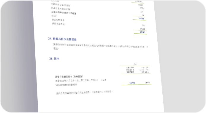 簡明中期財務報表附註 23. 遞延稅項 ַධࠋවଋᕘሪٙᜊਗνɨj ಥ࿆ϵຬʩ 13,994 ɚཧɚ̬ϋɓ˜ɓ˚ഐၑ (235) ිгࢨᕘ ฦूڌ˕ቖ€ڝൗ9 534 10 Չ˼Όࠦϗू˕ቖ 14,303 二零二四年六月三十日結算 ଡ଼ϓj (65) ַධ༟ପ 14,368 ַධࠋව 14,303 24. 歸類為持作出售資產 ᓥᗳމܵЪ̈ਯٙ༟ପܸණྠ࠰ಥ˄۬̚ИσධͦୋɓಂЇୋɘಂɖࡈӷԓԓЗٙҳ༟يุϵʱʘɓϵ ᛆूf 25. 股本 ʮ̡ ɚཧɚɧϋ 二零二四年 ɤɚ˜ɧɤɓ˚ 六月三十日 ಥ࿆ϵຬʩ 港幣百萬元 已發行及繳足股本(沒有面值): ɚཧɚ̬ϋʬ˜ɧɤ˚ʿɚཧɚɧϋɤɚ˜ɧɤɓ˚ഐၑ 5,850,000,000ٰ౷ஷٰ 10,449 10,449 ಂʫʮ̡אՉОڝ᙮ʮ̡ԨೌᒅΫëਯאᛙΫʮٰ̡ٙ΅f 72 太古地產有限公司 二零二四年中期報告