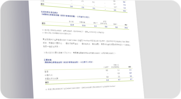 業務評述 發展中或持作未來發展的投資物業及酒店 (預計集團應佔總樓面面積,以百萬平方呎計) Иσā (1) ৢֳ ਕόИσ ྌʕ 總計 ፬ʮᅽ ཧਯيุ – – – – 0.8 0.8 ࠰ಥ 1.6 2.5 0.1 – 3.7 7.9 ʕʫή (2) – – – – 1.5 1.5 ߕ 1.6 2.5 0.1 – 6.0 10.2 總計 投資物業及酒店總計 (集團應佔總樓面面積(或預計總樓面面積),以百萬平方呎計) Иσā (1) ৢֳ ਕόИσ ྌʕ 總計 ፬ʮᅽ ཧਯيุ 13.9 11.6 2.3 0.8 6.0 34.6 總計 (1) ৢֳাɝৌਕజڌٙيุeᅀגʿண௪ʫiίቇٙ͜ઋرɨdॡ༣ɺήٙʱাɝԴ͜ᛆ༟ପf (2) ༈يุাɝৌਕజڌٙܵЪ೯࢝يุʫf ൯ርيุଡ଼Υܼ̍࠰ಥEIGHT STAR STREETʿ൳یThe RiverٙʊໝϓԶ̈ਯఊЗf೯࢝ʕٙИσධͦϞɘࡈ€̬ࡈί ࠰ಥeՇࡈίʕʫήeɓࡈίΙܓ̵Гԭeɓࡈί൳یʿɓࡈίइiණྠԨࠇྌίߕᒕڛٙʱɺήᎷ௪ɪ ೯࢝ɓࡈИσධͦf ɨڌΐ̈ɚཧɚ̬ϋʬ˜ɧɤ˚dණྠᏐЦ൯ርيุଡ଼Υٙᐼᅽࠦࠦጐ€אཫࠇᐼᅽࠦࠦጐf 買賣物業 (集團應佔總樓面面積(或預計總樓面面積),以百萬平方呎計) ೯࢝ʕא (1) ʊໝϓ ܵЪ೯࢝͜ 總計 0.0 1.1 1.1 ࠰ಥ – 0.5 0.5 ʕʫή 0.0 3.1 3.1 ߕʿՉ˼ήਜ 0.0 4.7 4.7 總計 (1) ࠰ಥʊໝϓٙ೯࢝ධܼͦ̍EIGHT STAR STREETdߕʿՉ˼ήਜʊໝϓٙ೯࢝ධܼͦ̍൳یٙThe Riverf 22 太古地產有限公司 二零二四年中期報告