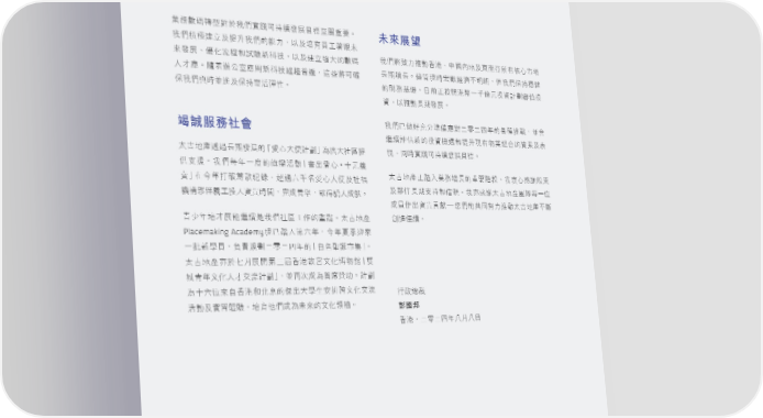 行政總裁報告 ุਕᅰᇁᔷۨ࿁Ңࡁྼስ̙ܵᚃ೯࢝ͦᅺЇᗫࠠࠅf 未來展望 ҢࡁጐܔͭʿʺҢࡁٙঐɢd˸ʿԃࡰʈഹ͊ Ңࡁਗ਼ߧɢપਗ࠰ಥeʕʫήʿ؇یԭהϞࣨː̹ఙ Ը೯࢝eᎴʷݴձ༊᜕อ߅Ҧd˸ʿܔͭ੶ɽٙᅰᇁ ڗಂᄣڗfኋ၍ତࣛ҃ᝈʔࣦdШҢࡁڭܵᖢ ɛʑࢫfᎇ䋠፬ʮ܃Ꮠ͜อ߅Ҧ൳ᒈ౷ཁdவԬਗ਼̙ᆽ ٙৌਕਿᓾdͦۃ͍ܲಥ࿆ɓɷᄂʩҳ༟ࠇྌᄲฐҳ ڭҢࡁၾࣛԨආʿڭܵᜳݺᅁf ༟d˸પਗڗಂ೯࢝f Ңࡁʊਂλ̂ʱ௪Ꮠ࿁ɚཧɚ̬ϋٙ၇ܿdԨึ 竭誠服務社會 ᘱᚃ൙Пอٙҳ༟ዚ༾ձʺତϞيุଡ଼Υٙሯ९ʿڌ ˄̚ήପீཀڗಂ೯࢝ٙ˜ฌːɽԴࠇྌ™މᄿɽٟਜ ତdΝࣛྼስ̙ܵᚃ೯࢝ͦᅺf h Զ˕౪fҢࡁӊϋɓܓٙᘶݺਗ˜ࣣ̈ฌː ɤʩ່ ˄̚ήପ͍ሸɝุਕᄣڗٙࠠࠅචݬdҢহːชᑽٰ؇ ር™ίʦῧॎᘪಛߏd൴ཀʬɷΤฌːɽԴʿٟ၅ ʿྫМڗಂ˕ܵձڦ፠fҢ͵ชᑽ˄̚ήପྠඟӊɓЗ ዚྫМ່ʈҳɝᘒ൮ࣛගdҁϓഛᑘd՟ᛨɛϓఱf ϓࡰЪ̈ᘒ൮্ᘠ{આࡁٙΝрɢપਗ˄̚ήପʔᓙ ڡˇϋʑ࢝ঐᘱᚃ݊ҢࡁٟਜʈЪٙࠠᓃf˄̚ήପ ௴ிԳᐶf Placemaking Academyତʊሸɝୋʬϋdʦϋࢀ֙ڎԸ ɓҭอኪࡰdࠋபྌɚཧɚ̬ϋٙ˜ͣЍ໋ሖ̹ණ™f ˄̚ήପ͵ɖ˜࢝කୋɧ֣࠰ಥ݂˖ʷ௹ي˜ᕐ ۬ڡϋ˖ʷɛʑʹݴࠇྌ™dԨΎϣϓމࢩᗎпfࠇྌ މɤʬЗԸІ࠰ಥձ̏ԯٙ௫̈ɽኪ͛τર༨˖ʷʹݴ Б݁ᐼ ݺਗʿྼ୦᜕dԃ˼ࡁϓމ͊Ըٙ˖ʷჯஙf 彭國邦 ࠰ಥdɚཧɚ̬ϋɞ˜ɞ˚ 16 太古地產有限公司 二零二四年中期報告