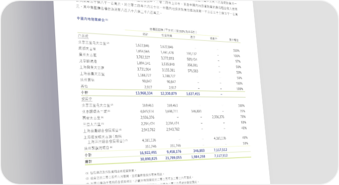 投資物業 — 中國內地 ฿ᚎ ʕʫήيุଡ଼ΥᅽࠦࠦጐΥމɧɷཧɘɤຬ̻˙ъdՉʕණྠᏐЦᛆूމɓɷɞϵɧɤຬ̻˙ъfʊໝϓيุɓ ɷ̬ϵຬ̻˙ъdɓɷʬϵɘɤຬ̻˙ъ͍ί೯࢝ʕfɚཧɚ̬ϋɪ̒ϋdԸІʕʫήҳ༟يุٙᏐЦॡږϗɝᐼᕘ Υಥ࿆ɧɤᄂɞɷɓϵຬʩfɚཧɚ̬ϋʬ˜ɧɤ˚dʕʫήҳ༟يุП࠽މಥ࿆ɓɷɧϵɧɤɚᄂʞɷɓϵຬ ʩdՉʕණྠᏐЦᛆूމಥ࿆ɞϵɞɤɞᄂɧɷɞϵຬʩf (1) 中國內地物業組合 ᐼᅽࠦࠦጐ€̻˙ъ€ܲ100%މਿࠇ ᐼࠇ ҳ༟يุ ৢֳ ྌʕ ᏐЦᛆू ʊໝϓ (2) 1,622,846 1,622,846 – – 100% ̏ԯɧԢˊ˄̚Ԣ 1,654,565 1,461,428 193,137 – 100% ϓே˄̚Ԣ 3,782,327 3,272,893 509,434 – 97% ᄿψ˄̚䁩 1,894,141 1,535,840 358,301 – 50% ̏ԯచಥ 3,731,964 3,155,381 576,583 – 50% ɪऎጳุ˄̚䁩 1,188,727 1,188,727 – – 50% ɪऎۃᛉ˄̚Ԣ 90,847 90,847 – – 100% ᄿψ䁩ѥ 2,917 2,917 – – 100% Չ˼ 13,968,334 12,330,879 1,637,455 – 小計 ೯࢝ʕ (2) 169,463 169,463 – – 100% ̏ԯɧԢˊ˄̚Ԣ (3) 4,045,514 3,698,711 346,803 – 35% ̏ԯచಥɚಂ (4) 2,936,376 – – 2,936,376 70% Гτ˄̚Ԣ (5) 2,294,474 2,294,474 – – 50% ɧԭ˄̚Ԣ (6) 2,943,782 2,943,782 – – 40% ɪऎۃᛉၝΥ೯࢝ධͦ ɪऎᄘ˄̚๕€ۃ၈ (7) 4,181,136 – – 4,181,136 40% ɪऎݱऋၝΥ೯࢝ධͦ (8) 351,746 351,746 – – 50% ᄿψၳᎲᝄධͦ 16,922,491 9,458,176 346,803 7,117,512 小計 30,890,825 21,789,055 1,984,258 7,117,512 總計 (1) ܼ̍ৢֳʿЪҳ༟ٙ͜ॡ༣يุf (2) ຄٸʊɚཧɚ̬ϋʬ˜ᗫௐdԨਗ਼ࠠอ೯࢝Ъཧਯ͜f (3) ˸፬ʮᅽމ˴ኬٙၝΥ೯࢝ධͦdࠇྌʱՇࡈචݬɚཧɚʞϋʿɚཧɚʬϋໝϓf (4) ˸ཧਯމ˴ኬٙၝΥ೯࢝ධͦd೯࢝˙ࣩ͍ίྌʕdࠇྌ͟ɚཧɚʬϋৎʱචݬໝϓf (5) ˸ཧਯމ˴ኬٙ೯࢝ධͦdࠇྌ͟ɚཧɚʞϋϋֵৎʱචݬໝϓfධͦΤ၈ܙ֛f (6) ၝΥ೯࢝ධͦdࠇྌ͟ɚཧɚʞϋৎໝϓf (7) ၝΥ೯࢝ධͦdܼ̍Ъ൯ርٙ͜Иσʱf೯࢝˙ࣩ͍ίྌʕdࠇྌ͟ɚཧɚɖϋৎʱචݬໝϓf (8) ᄿψটᝄਜɓࡈၝΥ೯࢝ධͦٙཧਯʱd˸ɪމ࿚Їɚཧɚ̬ϋʬ˜ɧɤ˚הᐏ՟ٙή෯ᐼᅽࠦࠦጐfᗫʹᙄٙආɓӉᖦࠈਗ਼̙ঐ ᄣ̋ᐼᅽࠦࠦጐЇߒɓϵʬɤɓຬʞɷ̻˙ъfණྠܵϞ༈ධͦཧਯʱϵʱʘʞɤᛆूf೯࢝˙ࣩ͍ίྌʕfࡈධͦࠇྌ͟ɚཧɚɖ ϋɪ̒ϋৎʱචݬໝϓf ɚཧɚ̬ϋɪ̒ϋdණྠίʕʫήҳ༟يุଡ଼Υٙॡږϗɝᐼᕘމಥ࿆ɚɤ̬ᄂ̬ɷʞϵຬʩd༰ɚཧɚɧϋΝಂᄣ ̋ϵʱʘɘdˀ݈Ңࡁᐄ༶̹۬ٙᒅيਠఙॡ˒ଡ଼ΥᎴʷʿɚཧɚɧϋᄣܵϓே˄̚Ԣᛆूהᄣ̋ٙॡږϗɝdШ ʱʺషΪɚཧɚ̬ϋɪ̒ϋܲᐄุᕘࠇၑٙॡږɨൻϾתቖf 29