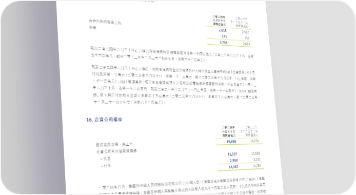 15. 使用權資產 ණྠ€Ъމוॡɛॡ༣ɺήe፬ʮᅽeࡑࢫʿண௪fৰ࠰ಥݔԬڗಂॡ༣ɺή̮dॡ༣ΥߒɓছܲɓϋЇʞɤϋ ٙո֛ಂࠢdШ͵Ϟ̙ঐڝϞᚃಂᛆʿۃ˟ॡ༣ᛆfॡ༣ૢಛɗࡈйਠd̍ўᄿعʔΝٙૢಛձૢf ʊᆽႩٙԴ͜ᛆ༟ପၾ˸ɨᗳۨٙ༟ପϞᗫj 二零二四年 ɚཧɚɧϋ 六月三十日 ɤɚ˜ɧɤɓ˚ 港幣百萬元 ಥ࿆ϵຬʩ 2,618 2,502 ܵЪІٙ͜ॡ༣ɺή 141 153 يุ 2,759 2,655 ࿚Їɚཧɚ̬ϋʬ˜ɧɤ˚˟ʬࡈ˜ಂගᄣᒅٙԴ͜ᛆ༟ପމಥ࿆ɓɷ̬ϵຬʩ€ɚཧɚɧϋʬ˜ɧɤ˚jಥ࿆ ʞɷʬϵຬʩi࿚Їɚཧɚɧϋɤɚ˜ɧɤɓ˚˟ϋܓjಥ࿆ʬɷɚϵຬʩf (a)˜ᐄ༶ุਕ™ධɨʊ ࿚Їɚཧɚ̬ϋʬ˜ɧɤ˚˟ʬࡈ˜d͜ॡ༣ٙତږݴ̈ᐼᕘʊࠇɝၝΥତږݴඎڌʕٙ ˹лࢹಥ࿆ɓɷຬʩ€ɚཧɚɧϋʬ˜ɧɤ˚jಥ࿆ɓɷɓϵຬʩi࿚Їɚཧɚɧϋɤɚ˜ɧɤɓ˚˟ϋܓjಥ࿆ (b)˜ᐄ༶ุਕ™ධɨԸІᐄ༶ٙତږʘಂʿЭᄆ࠽༟ପॡ༣൬͜ಥ࿆ɓɷʞϵຬʩ€ɚཧɚɧ ɚɷɓϵຬʩi ϋʬ˜ɧɤ˚jಥ࿆ɓɷʬϵຬʩi࿚Їɚཧɚɧϋɤɚ˜ɧɤɓ˚˟ϋܓjಥ࿆ɧɷɓϵຬʩiʿ(c)˜ፄ༟ุ ਕ™ධɨॡ༣˹ಛ͉ٙږʱಥ࿆ɧɷɘϵຬʩ€ɚཧɚɧϋʬ˜ɧɤ˚jಥ࿆ɧɷɞϵຬʩi࿚Їɚཧɚɧϋ ɤɚ˜ɧɤɓ˚˟ϋܓjಥ࿆ɞɷɚϵຬʩf 16. 合資公司權益 二零二四年 ɚཧɚɧϋ 六月三十日 ɤɚ˜ɧɤɓ˚ 港幣百萬元 ಥ࿆ϵຬʩ 19,860 19,276 ᏐЦ༟ପଋ࠽dڢɪ̹ Υ༟ʮ̡ה˞࠾ಛಯᅡ௪ – еࢹ 11,537 11,650 – ࠇࢹ 2,950 3,131 14,487 14,781 ɚཧɚ̬ϋʬ˜dණྠၾʕɛྪڭᎈٰ΅Ϟࠢʮ̡€˜ʕɛྪ™ණྠʿჃݱණྠછٰϞࠢʮ̡€˜Ⴣݱ™ණྠ ᖦࠈٰᛆʿවᛆᔷᜫᙄdණྠʿʕɛྪණྠʱй˸ߒɛ͏࿆ɞᄂɘɷɓϵຬʩʿɛ͏࿆ɚɤɘᄂɞɷ̬ϵຬʩ ٙ˾ᄆΣჃݱණྠϞૢϗᒅచಥɚಂධͦʮ̡ϵʱʘɤ̬ᓃɞɘʞʿϵʱʘ̬ɤɘᓃɞɘʞٰ͉ᛆूd༈ධϗ ᒅաࠢ߰ʍӔૢᐏတԑʑঐҁϓf༈ධʹʊɞ˜ڋҁϓfᎇഹʹҁϓܝdණྠచಥɚಂٙᛆू͟ ϵʱʘɧɤʞᄣЇϵʱʘ̬ɤɘᓃɞɘʞdϾʕɛྪණྠܵϞచಥɚಂϵʱʘ̬ɤɘᓃɞɘʞᛆूf 67