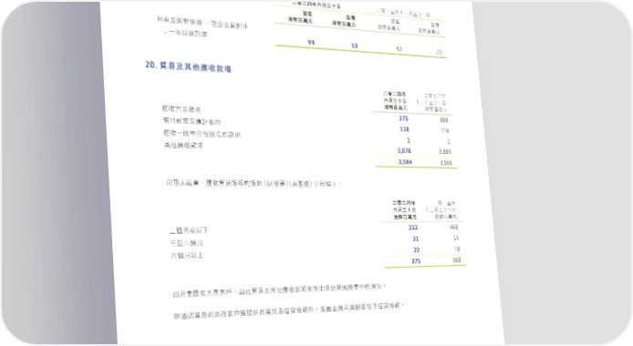 簡明中期財務報表附註 19. 衍生金融工具 ණྠ̥ึމ၍ଣᆑίࠬᎈϾԴ͜ࠃ͛ږፄʈՈf͟ࠃ͛ʈՈٙޮᑦঐתቖ࿁әٙ༟ପeࠋවאʹٙᑦฦձϗ ूdණྠΪϾ̙ਗ਼Չ̹ఙࠬᎈಯЇ௰Эfණྠٙ݁ഄ݊ʔЪҳዚٙࠃ͛ʈՈʹf 二零二四年六月三十日 ɚཧɚɧϋɤɚ˜ɧɤɓ˚ 資產 負債 ༟ପ ࠋව 港幣百萬元 港幣百萬元 ಥ࿆ϵຬʩ ಥ࿆ϵຬʩ лଟʿ༨࿆દಂ { ତږݴඎ࿁ә – ɓϋ˸ܝՑಂ 99 10 57 22 20. 貿易及其他應收款項 二零二四年 ɚཧɚɧϋ 六月三十日 ɤɚ˜ɧɤɓ˚ 港幣百萬元 ಥ࿆ϵຬʩ 375 500 Ꮠϗ൱ሪධ 138 116 ཫ˹ಛධʿᏐࠇϗू 1 1 Ꮠϗɓගʕʧછٰʮ̡ಛධ 3,070 2,889 Չ˼Ꮠϗಛධ 3,584 3,506 ಂ͋ഐၑdᏐϗ൱ሪධٙሪᙧ€˸೯ୃ˚މਿᓾʱؓνɨj 二零二四年 ɚཧɚɧϋ 六月三十日 ɤɚ˜ɧɤɓ˚ 港幣百萬元 ಥ࿆ϵຬʩ 332 468 ɧࡈ˜א˸ɨ 21 14 ɧЇʬࡈ˜ 22 18 ʬࡈ˜˸ɪ 375 500 ͟ණྠϞɽඎ܄˒dΪϤ൱ʿՉ˼ᏐϗಛධԨೌ̈ତڦ൲ࠬᎈණʕٙઋرf ৰৢֳุਕٙਠਕ܄˒ᐏԶਠุ൱ڦ൲ૢಛ̮dණྠԨೌΣՉᚥ܄બʚڦ൲ૢಛf 70 太古地產有限公司 二零二四年中期報告