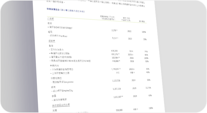 物業買賣 ฿ᚎ ൯ርيุଡ଼Υܼ̍࠰ಥEIGHT STAR STREETʿ൳یThe RiverٙʊໝϓԶ̈ਯఊЗf೯࢝ʕٙИσධͦϞɘࡈ€̬ࡈί ࠰ಥeՇࡈίʕʫήeɓࡈίΙܓ̵Гԭeɓࡈί൳یʿɓࡈίइiණྠԨࠇྌίߕᒕڛٙʱɺήᎷ௪ɪ ೯࢝ɓࡈИσධͦf 物業買賣組合(於二零二四年六月三十日) ᐼᅽࠦࠦጐ€̻˙ъ ྼყāཫࠇ €ܲ100%މਿࠇ ʈംʈ˚ಂ ᏐЦᛆू ʊໝϓ ࠰ಥ (1) – ᝄ˺EIGHT STAR STREET 2,178 2022 100% ൳ی (1) – ߡқ̹The River 9,114 2022 20% ೯࢝ʕ ࠰ಥ – ර϶Ѧऎޮʆ 638,305 2024 25% (2) – ࣵᝄʫήݬୋ178 692,276 2025ৎ 80% (3) – ᝄ˺ެΧɽ༸؇269 102,984 2026 100% (4) – 㤚गߵެ༸983-987AʿᏵऎ16-94 440,000 2028 50% ʕʫή (5) – ɪऎۃᛉၝΥ೯࢝ධͦ 1,159,057 2025ৎ 40% – ɪऎᄘ˄̚๕ 40% ܙ֛ ྌʕ Ιܓ̵Гԭ – ඩ̋༺یSavyavasa 1,122,728 2024 50% ൳ی – ߡқ̹Empire City 5,357,318 2029 15.73% इ (4) – ਟԋೌᇞཥ༩ 1,631,507 2029 40% ܵЪ೯࢝אԶ̈ਯ ߕ – НᖯԢ༺ψᒕڛSouth Brickell Key 550,000 100% ྌʕ – НᖯԢ༺ψᒕڛBrickell City Centre – (6) North Squared͜ή 523,000 100% ʔቇ͜ (1) ቱɨ̙̈ਯࠦጐf (2) ʔܼ̍ɓගࠦጐߒɚɷཧɚ̻˙ъٙཧਯਠ⧕f (3) ʔܼ̍ɓࡈࠦጐߒɓຬɧɷɓϵɘɤɖ̻˙ъٙཧਯ̨̻f (4) ᐼᅽࠦࠦጐᐼࠇʥϞܙһอf (5) ̥ࠇɝИσᐼᅽࠦࠦጐf (6) ܸ̙̈ਯᅽࠦf 39