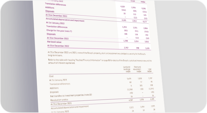 NOTES TO THE FINANCIAL STATEMENTS 15. Property, Plant and Equipment (continued) Land and Plant and buildings equipment Total HK$M HK$M HK$M Cost: At 1st January 2022 4,307 1,978 6,285 Translation differences (152) (69) (221) Additions 10 115 125 Disposals – (12) (12) At 31st December 2022 4,165 2,012 6,177 Accumulated depreciation and impairment: At 1st January 2022 1,353 1,551 2,904 Translation differences (61) (51) (112) Charge for the year (note 7) 106 126 232 Disposals – (12) (12) At 31st December 2022 1,398 1,614 3,012 Net book value: At 31st December 2022 2,767 398 3,165 At 31st December 2022 and 2021, none of the Group’s property, plant and equipment was pledged as security for the Group’s long-term loans. Refer to the table with heading “Audited Financial Information” on page 86 for details of the Group’s capitalised interest rates and the amount of interest capitalised. Land and Plant and buildings equipment Total HK$M HK$M HK$M Cost: At 1st January 2021 5,479 1,818 7,297 Translation differences 68 17 85 Additions 9 181 190 Disposals (1,216) (38) (1,254) Net transfers to investment properties (note 16) (49) – (49) Revaluation surplus 16 – 16 At 31st December 2021 4,307 1,978 6,285 Accumulated depreciation and impairment: At 1st January 2021 1,521 1,454 2,975 Translation differences 25 13 38 Charge for the year (note 7) 152 121 273 Disposals (337) (37) (374) Transfers to investment properties (note 16) (8) – (8) At 31st December 2021 1,353 1,551 2,904 Net book value: At 31st December 2021 2,954 427 3,381 156
