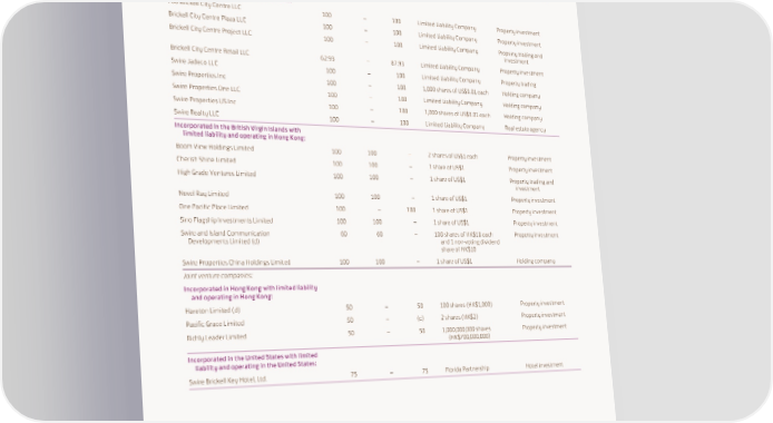 PRINCIPAL SUBSIDIARY, JOINT VENTURE AND ASSOCIATED COMPANIES Showing proportion of capital owned at 31st December 2022 Owned Attributable Owned by to the Group directly subsidiaries Issued and fully paid up % % % shares/Registered capital Principal activities Subsidiary companies (continued): Incorporated in the United States with limited liability and operating in the United States: 700 Brickell City Centre LLC 100 – 100 Limited Liability Company Property investment Brickell City Centre Plaza LLC 100 – 100 Limited Liability Company Property investment Brickell City Centre Project LLC 100 – 100 Limited Liability Company Property trading and investment Brickell City Centre Retail LLC 62.93 – 87.93 Limited Liability Company Property investment Swire Jadeco LLC 100 – 100 Limited Liability Company Property trading Swire Properties Inc 100 – 100 1,000 shares of US$0.01 each Holding company Swire Properties One LLC 100 – 100 Limited Liability Company Holding company Swire Properties US Inc 100 – 100 1,000 shares of US$0.01 each Holding company Swire Realty LLC 100 – 100 Limited Liability Company Real estate agency Incorporated in the British Virgin Islands with limited liability and operating in Hong Kong: Boom View Holdings Limited 100 100 – 2 shares of US$1 each Property investment Cherish Shine Limited 100 100 – 1 share of US$1 Property investment High Grade Ventures Limited 100 100 – 1 share of US$1 Property trading and investment Novel Ray Limited 100 100 – 1 share of US$1 Property investment One Pacific Place Limited 100 – 100 1 share of US$1 Property investment Sino Flagship Investments Limited 100 100 – 1 share of US$1 Property investment Swire and Island Communication 60 60 – 100 shares of HK$10 each Property investment Developments Limited (d) and 1 non-voting dividend share of HK$10 Swire Properties China Holdings Limited 100 100 – 1 share of US$1 Holding company Joint venture companies: Incorporated in Hong Kong with limited liability and operating in Hong Kong: Hareton Limited (d) 50 – 50 100 shares (HK$1,000) Property investment Pacific Grace Limited 50 – (c) 2 shares (HK$2) Property investment Richly Leader Limited 50 – 50 1,000,000,000 shares Property investment (HK$700,000,000) Incorporated in the United States with limited liability and operating in the United States: Swire Brickell Key Hotel, Ltd. 75 – 75 Florida Partnership Hotel investment 202
