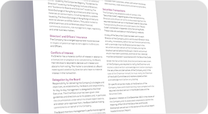 Continuous Professional Development • detailed monthly management accounts consisting of The Company makes available continuous professional statements of profit or loss, financial position and cash development for all Directors at the expense of the Company flows compared to budget, together with forecasts so as to develop and refresh their knowledge and skills. • internal and external audit reports All Directors have been provided with “A Guide on Directors’ • feedback from customers, others with whom the Group Duties” issued by the Companies Registry, “Guidelines for does business, trade associations and service providers. Directors” issued by the Hong Kong Institute of Directors Securities Transactions and “Guidance for Boards and Directors” issued by The The Company has adopted a code of conduct (the Stock Exchange of Hong Kong Limited and other training “Securities Code”) regarding securities transactions by materials on various topics, including regulatory updates Directors and officers on terms no less exacting than the issued by The Stock Exchange of Hong Kong Limited and required standard set out in the Model Code for Securities external advisers and ESG matters. They were invited to Transactions by Directors of Listed Issuers (the “Model attend seminars and conferences about financial, Code”) contained in Appendix 10 to the Listing Rules. commercial, economic, risk management, legal, regulatory These rules are available on the Company’s website. and other business matters. A copy of the Securities Code has been sent to each Directors’ and Officers’ Insurance Director of the Company and is sent to each Director twice The Company has arranged appropriate insurance cover annually, immediately before the two financial period ends, in respect of potential legal actions against its Directors with a reminder that the Director cannot deal in the and Officers. securities and derivatives of the Company during the blackout period before the Group’s interim and annual Conflicts of Interest results have been published, and that all their dealings If a Director has a material conflict of interest in relation to must be conducted in accordance with the Securities Code. a transaction or proposal to be considered by the Board, Under the Securities Code, Directors and senior executives the individual is required to declare such interest and of the Company are required to notify the Chairman and abstains from voting. The matter is considered at a Board receive a dated written acknowledgement before dealing in meeting and voted on by Directors who have no material the securities and derivatives of the Company and, in the interest in the transaction. case of the Chairman himself, he must notify the Chairman Delegation by the Board of the Audit Committee and receive a dated written Responsibility for delivering the Company’s strategies and acknowledgement before any dealing. objectives, as established by the Board, and responsibility On specific enquiries made, all the Directors of the for day-to-day management is delegated to the Chief Company have confirmed that they have complied with the Executive. The Chief Executive has been given clear required standard set out in the Model Code and the guidelines and directions as to his powers and, in particular, Securities Code. the circumstances under which he should report back to, Directors’ interests at 31st December 2022 in the shares of and obtain prior approval from, the Board before making the Company and its associated corporations (within the commitments on behalf of the Company. meaning of Part XV of the Securities and Futures The Board monitors management’s performance against Ordinance) are set out in the section of this annual report the achievement of financial and non-financial measures, headed Directors’ Report. the principal items monitored being: 97 SWIRE PROPERTIES ANNUAL REPORT 2022