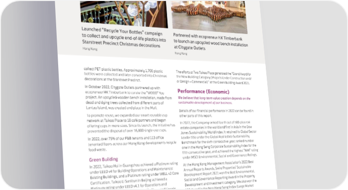 Launched “Recycle Your Bottles” campaign Partnered with ecopreneur HK Timberbank to collect and upcycle end-of-life plastics into to launch an upcycled wood bench installation Starstreet Precinct Christmas decorations at Citygate Outlets Hong Kong Hong Kong collect PET plastic bottles. Approximately 1,700 plastic The efforts at Two Taikoo Place generated the “Grand Award for bottles were collected and later converted into Christmas the New Building Category (Projects Under Construction and/ decorations at the Starstreet Precinct. or Design – Commercial)” at the Green Building Award 2021. In October 2022, Citygate Outlets partnered up with Performance (Economic) ecopreneur HK Timberbank to curate the “WOOD” You project. An upcycled wooden bench installation, made from We believe that long-term value creation depends on the dead and dying trees collected from different parts of sustainable development of our business. Lantau Island, was created and place in the Mall. Details of our financial performance in 2022 can be found in To promote reuse, we expanded our smart reusable cup other parts of this report. network at Taikoo Place to 10 café partners and began In 2022, the Company ranked fourth out of 500-plus real offering cups in more sizes. Since its launch, the initiative has estate companies in the world and first in Asia in the Dow prevented the disposal of over 16,800 single-use cups. Jones Sustainability World Index. It retained its Global Sector In 2022, over 75% of our F&B tenants and 113 office Leader title under the Global Real Estate Sustainability tenanted floors across our Hong Kong developments recycle Benchmark for the sixth consecutive year; ranked number food waste. one in the Hang Seng Corporate Sustainability Index for the Green Building fifth consecutive year, and achieved the highest “AAA” rating under MSCI Environmental, Social and Governance Ratings. In 2022, Taikoo Hui in Guangzhou achieved a Platinum rating At the Hong Kong Management Association’s 2022 Best under LEED v4 for Building Operations and Maintenance: Annual Reports Awards, Swire Properties’ Sustainable Existing Buildings, and a Platinum rating under WELL v2 Core Development Report 2021 won the Best Environmental, Certification. Taikoo Li Sanlitun in Beijing achieved a Social and Governance Reporting Award in the Property Platinum rating under LEED v4.1 for Operations and Development and Investment category. We also won the Maintenance: Existing Buildings. Pacific Place and Lincoln ESG Award in the Non-Hang Seng Index (Large Market House in Hong Kong achieved Platinum ratings under BEAM Capitalisation) Category at the Best Corporate Governance Plus for Existing Building v2.0. and ESG Awards 2022, organised by the Hong Kong Institute Swire Properties won the Pioneer Award in Green Building of Certified Public Accountants. Leadership Category (Facilities Management) at the Green As of 31 December 2022, approximately 60% of our Building Award 2021, organised by the Hong Kong Green financing comes from green bonds, sustainability-linked Building Council and the Professional Green Building loans and green loans. Council; and was the Sustainability Award winner at the RICS Awards 2022 Hong Kong. Further details of our sustainable development performance, including details of our SD 2030 Strategy, can be found in our Sustainable Development Report 2022. 127 SWIRE PROPERTIES ANNUAL REPORT 2022