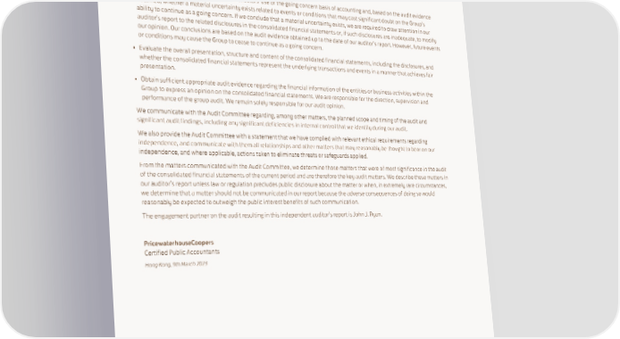 • Obtain an understanding of internal control relevant to the audit in order to design audit procedures that are appropriate in the circumstances, but not for the purpose of expressing an opinion on the effectiveness of the Group’s internal control. • Evaluate the appropriateness of accounting policies used and the reasonableness of accounting estimates and related disclosures made by the directors. • Conclude on the appropriateness of the directors’ use of the going concern basis of accounting and, based on the audit evidence obtained, whether a material uncertainty exists related to events or conditions that may cast significant doubt on the Group’s ability to continue as a going concern. If we conclude that a material uncertainty exists, we are required to draw attention in our auditor’s report to the related disclosures in the consolidated financial statements or, if such disclosures are inadequate, to modify our opinion. Our conclusions are based on the audit evidence obtained up to the date of our auditor’s report. However, future events or conditions may cause the Group to cease to continue as a going concern. • Evaluate the overall presentation, structure and content of the consolidated financial statements, including the disclosures, and whether the consolidated financial statements represent the underlying transactions and events in a manner that achieves fair presentation. • Obtain sufficient appropriate audit evidence regarding the financial information of the entities or business activities within the Group to express an opinion on the consolidated financial statements. We are responsible for the direction, supervision and performance of the group audit. We remain solely responsible for our audit opinion. We communicate with the Audit Committee regarding, among other matters, the planned scope and timing of the audit and significant audit findings, including any significant deficiencies in internal control that we identify during our audit. We also provide the Audit Committee with a statement that we have complied with relevant ethical requirements regarding independence, and communicate with them all relationships and other matters that may reasonably be thought to bear on our independence, and where applicable, actions taken to eliminate threats or safeguards applied. From the matters communicated with the Audit Committee, we determine those matters that were of most significance in the audit of the consolidated financial statements of the current period and are therefore the key audit matters. We describe these matters in our auditor’s report unless law or regulation precludes public disclosure about the matter or when, in extremely rare circumstances, we determine that a matter should not be communicated in our report because the adverse consequences of doing so would reasonably be expected to outweigh the public interest benefits of such communication. The engagement partner on the audit resulting in this independent auditor’s report is John J. Ryan. PricewaterhouseCoopers Certified Public Accountants Hong Kong, 9th March 2023 SWIRE PROPERTIES ANNUAL REPORT 2022 133