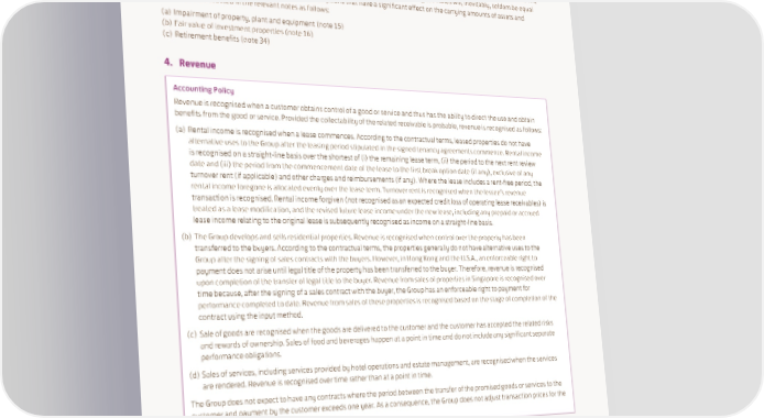 3. Critical Accounting Estimates and Judgements Estimates and judgements used in preparing the financial statements are continually evaluated and are based on historical experience and other factors, including expectations of future events that are believed to be reasonable under the circumstances. The Group makes estimates and assumptions concerning the future. The resulting accounting estimates will, inevitably, seldom be equal to the related actual results. The estimates and assumptions that have a significant effect on the carrying amounts of assets and liabilities are discussed in the relevant notes as follows: (a) Impairment of property, plant and equipment (note 15) (b) Fair value of investment properties (note 16) (c) Retirement benefits (note 34) 4. Revenue Accounting Policy Revenue is recognised when a customer obtains control of a good or service and thus has the ability to direct the use and obtain benefits from the good or service. Provided the collectability of the related receivable is probable, revenue is recognised as follows: (a) Rental income is recognised when a lease commences. According to the contractual terms, leased properties do not have alternative uses to the Group after the leasing period stipulated in the signed tenancy agreements commence. Rental income is recognised on a straight-line basis over the shortest of (i) the remaining lease term, (ii) the period to the next rent review date and (iii) the period from the commencement date of the lease to the first break option date (if any), exclusive of any turnover rent (if applicable) and other charges and reimbursements (if any). Where the lease includes a rent-free period, the rental income foregone is allocated evenly over the lease term. Turnover rent is recognised when the lesseeās revenue transaction is recognised. Rental income forgiven (not recognised as an expected credit loss of operating lease receivables) is treated as a lease modification, and the revised future lease income under the new lease, including any prepaid or accrued lease income relating to the original lease is subsequently recognised as income on a straight-line basis. (b) The Group develops and sells residential properties. Revenue is recognised when control over the property has been transferred to the buyers. According to the contractual terms, the properties generally do not have alternative uses to the Group after the signing of sales contracts with the buyers. However, in Hong Kong and the U.S.A., an enforceable right to payment does not arise until legal title of the property has been transferred to the buyer. Therefore, revenue is recognised upon completion of the transfer of legal title to the buyer. Revenue from sales of properties in Singapore is recognised over time because, after the signing of a sales contract with the buyer, the Group has an enforceable right to payment for performance completed to date. Revenue from sales of these properties is recognised based on the stage of completion of the contract using the input method. (c) Sale of goods are recognised when the goods are delivered to the customer and the customer has accepted the related risks and rewards of ownership. Sales of food and beverages happen at a point in time and do not include any significant separate performance obligations. (d) Sales of services, including services provided by hotel operations and estate management, are recognised when the services are rendered. Revenue is recognised over time rather than at a point in time. The Group does not expect to have any contracts where the period between the transfer of the promised goods or services to the customer and payment by the customer exceeds one year. As a consequence, the Group does not adjust transaction prices for the time value of money. SWIRE PROPERTIES ANNUAL REPORT 2022 145