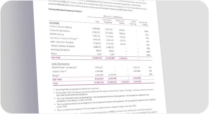 Investment Properties – Chinese Mainland Overview The property portfolio in the Chinese Mainland comprises an aggregate of 22.5 million square feet of space, 14.1 million square feet of which is attributable to the Group. Completed properties amount to 13.9 million square feet, with 8.6 million square feet under development. Total attributable gross rental income from investment properties in the Chinese Mainland was HK$5,172 million in 2022. At 31st December 2022, the investment properties in the Chinese Mainland were valued at HK$108,978 million. Of this amount, the Group’s attributable interest was HK$73,665 million. (1) Chinese Mainland Property Portfolio GFA (sq. ft.) (100% Basis) Investment Hotels and Under Attributable Total Properties Others Planning Interest Completed Taikoo Li Sanlitun, Beijing 1,789,000 1,619,537 169,463 – 100% Taikoo Hui, Guangzhou 3,782,327 3,272,893 509,434 – 97% INDIGO, Beijing 1,894,141 1,535,840 358,301 – 50% (2) 1,654,565 1,461,428 193,137 – 65% Sino-Ocean Taikoo Li Chengdu HKRI Taikoo Hui, Shanghai 3,536,619 3,148,792 387,827 – 50% Taikoo Li Qiantan, Shanghai 1,188,727 1,188,727 – – 50% Hui Fang, Guangzhou 90,847 90,847 – – 100% Others 2,917 2,917 – – 100% Sub-Total 13,939,143 12,320,981 1,618,162 – Under Development (3) INDIGO Phase Two, Beijing 4,045,514 – – 4,045,514 35% (4) Taikoo Li Xi’an 2,364,668 – – 2,364,668 70% (5) Sanya 2,143,440 2,143,440 – – 50% Sub-Total 8,553,622 2,143,440 – 6,410,182 Total 22,492,765 14,464,421 1,618,162 6,410,182 (1) Including hotels and properties leased for investment. (2) In December 2022, the Group acquired an additional 15% interest in Sino-Ocean Taikoo Li Chengdu. The Group’s interest increased from 50% to 65% after the transaction. (3) This is an office-led mixed-use development. The development scheme is being planned. The development is planned to be completed in two phases, in 2025 and 2026. (4) This is a retail-led mixed-use development. The development scheme is being planned. The development is planned to be completed in late 2025. (5) This is a retail-led development. The development is planned to be completed in phases from late 2024. Gross rental income (after deduction of rental concessions of HK$113 million) from the Group’s investment property portfolio in the Chinese Mainland was HK$3,324 million in 2022, 8% lower than in 2021, reflecting the COVID-19 resurgence in the cities where our malls operate. This partly offset by a full year contribution from Taikoo Li Sanlitun West. 47 SWIRE PROPERTIES ANNUAL REPORT 2022