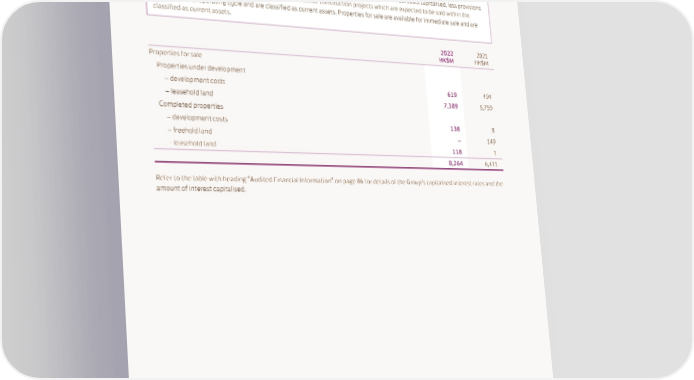 23. Properties for Sale Accounting Policy Properties for sale comprise freehold and leasehold land at cost, construction costs and interest costs capitalised, less provisions for possible losses. Properties under development are active construction projects which are expected to be sold within the Group’s normal operating cycle and are classified as current assets. Properties for sale are available for immediate sale and are classified as current assets. 2022 2021 HK$M HK$M Properties for sale Properties under development – development costs 619 494 – leasehold land 7,389 5,759 Completed properties – development costs 138 8 – freehold land – 149 – leasehold land 118 1 8,264 6,411 Refer to the table with heading “Audited Financial Information” on page 86 for details of the Group’s capitalised interest rates and the amount of interest capitalised. SWIRE PROPERTIES ANNUAL REPORT 2022 173