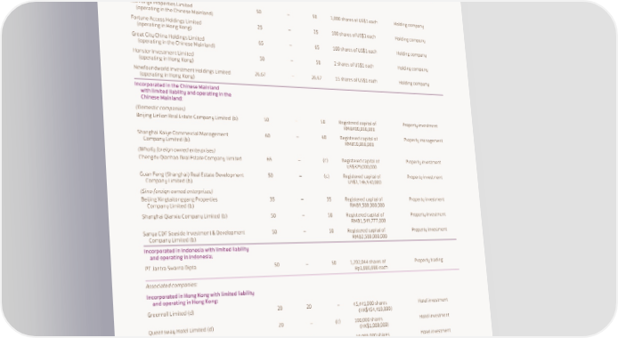Owned Attributable Owned by to the Group directly subsidiaries Issued and fully paid up % % % shares/Registered capital Principal activities Joint venture companies (continued): Incorporated in the British Virgin Islands with limited liability: Dazhongli Properties Limited 50 – 50 1,000 shares of US$1 each Holding company (operating in the Chinese Mainland) Fortune Access Holdings Limited 25 – 25 100 shares of US$1 each Holding company (operating in Hong Kong) Great City China Holdings Limited 65 – 65 100 shares of US$1 each Holding company (operating in the Chinese Mainland) Honster Investment Limited 50 – 50 2 shares of US$1 each Holding company (operating in Hong Kong) Newfoundworld Investment Holdings Limited 26.67 – 26.67 15 shares of US$1 each Holding company (operating in Hong Kong) Incorporated in the Chinese Mainland with limited liability and operating in the Chinese Mainland: (Domestic companies) Beijing Linlian Real Estate Company Limited (b) 50 – 50 Registered capital of Property investment RMB400,000,000 Shanghai Kaiye Commercial Management 60 – 60 Registered capital of Property management Company Limited (b) RMB10,000,000 (Wholly foreign owned enterprises) Chengdu Qianhao Real Estate Company Limited 65 – (c) Registered capital of Property investment US$329,000,000 Guan Feng (Shanghai) Real Estate Development 50 – (c) Registered capital of Property investment Company Limited (b) US$1,136,530,000 (Sino-foreign owned enterprises) Beijing Xingtaitonggang Properties 35 – 35 Registered capital of Property investment Company Limited (b) RMB9,500,000,000 Shanghai Qianxiu Company Limited (b) 50 – 50 Registered capital of Property investment RMB1,549,777,000 Sanya CDF Seaside Investment & Development 50 – 50 Registered capital of Property investment Company Limited (b) RMB2,500,000,000 Incorporated in Indonesia with limited liability and operating in Indonesia: PT Jantra Swarna Dipta 50 – 50 1,202,044 shares of Property trading Rp1,000,000 each Associated companies: Incorporated in Hong Kong with limited liability and operating in Hong Kong: Greenroll Limited (d) 20 20 – 45,441,000 shares Hotel investment (HK$454,410,000) Queensway Hotel Limited (d) 20 – (c) 100,000 shares Hotel investment (HK$1,000,000) Shangri-La International Hotels (Pacific Place) 20 20 – 10,005,000 shares Hotel investment Limited (HK$10,005,000) Incorporated in Vietnam with limited liability and operating in Vietnam: City Garden Thu Thiem Limited Liability 20 – (c) Charter capital of Property trading Company (d) VND969,797,500,000 SWIRE PROPERTIES ANNUAL REPORT 2022 203