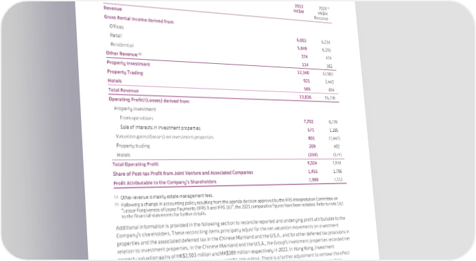 REVIEW OF OPERATIONS 2022 2021(2) HK$M HK$M Restated Revenue Gross Rental Income derived from Offices 6,003 6,214 Retail 5,849 6,191 Residential 374 474 Other Revenue (1) 114 102 Property Investment 12,340 12,981 Property Trading 921 2,443 Hotels 565 894 Total Revenue 13,826 16,318 Operating Profit/(Losses) derived from Property investment From operations 7,702 8,278 Sale of interests in investment properties 571 1,185 Valuation gains/(losses) on investment properties 801 (1,947) Property trading 209 492 Hotels (259) (174) Total Operating Profit 9,024 7,834 Share of Post-tax Profit from Joint Venture and Associated Companies 1,455 1,786 Profit Attributable to the Company’s Shareholders 7,980 7,112 (1) Other revenue is mainly estate management fees. (2) Following a change in accounting policy resulting from the agenda decision approved by the IFRS Interpretation Committee on “Lessor Forgiveness of Lease Payments (IFRS 9 and IFRS 16)”, the 2021 comparative figures have been restated. Refer to note 1(c) to the financial statements for further details. Additional information is provided in the following section to reconcile reported and underlying profit attributable to the Company’s shareholders. These reconciling items principally adjust for the net valuation movements on investment properties and the associated deferred tax in the Chinese Mainland and the U.S.A., and for other deferred tax provisions in relation to investment properties. In the Chinese Mainland and the U.S.A., the Group’s investment properties recorded net property valuation gains of HK$2,503 million and HK$389 million respectively in 2022. In Hong Kong, investment properties recorded net property valuation losses of HK$1,166 million. There is a further adjustment to remove the effect of the movement in the fair value of the liability in respect of a put option in favour of the owner of a non-controlling interest. Amortisation of right-of-use assets classified as investment properties is charged to underlying profit. 32