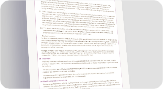 22. Financial Instruments by Category (continued) Accounting Policy (continued) Financial Assets (continued) (c) Measurement (continued) (i) Amortised cost: Assets that are held for collection of contractual cash flows, where those cash flows represent solely payments of principal and interest, are measured at amortised cost. Interest income from these financial assets is included in finance income using the effective interest rate method. Any gain or loss arising on derecognition is recognised directly in the consolidated statement of profit or loss and presented in other net gains/(losses) together with foreign exchange gains and losses. (ii) FVOCI: Assets that are held for collection of contractual cash flows and for selling the financial assets, where the assets’ cash flows represent solely payments of principal and interest, are measured at FVOCI. Movements in the carrying amount are taken through OCI, except for the recognition of impairment gains or losses, interest income and foreign exchange gains and losses, which are recognised in the consolidated statement of profit or loss. When the financial asset is derecognised, the cumulative gain or loss previously recognised in OCI is reclassified from equity to the consolidated statement of profit or loss and recognised in other net gains/(losses). Interest income from these financial assets is included in finance income using the effective interest method. Foreign exchange gains and losses are presented in other net gains/(losses). (iii) FVPL: Assets that do not meet the criteria for amortised cost or FVOCI are measured at FVPL. A gain or loss on a debt investment that is subsequently measured at FVPL is recognised in the consolidated statement of profit or loss and presented net within other net gains/(losses) in the period in which it arises. – Equity instruments: The Group subsequently measures all equity investments at fair value. Dividends from such investments are recognised in the consolidated statement of profit or loss as other net gains/(losses) when the Group’s right to receive payments is established. Where the Group’s management has elected to present fair value gains and losses on equity investments in OCI, there is no subsequent reclassification of fair value gains and losses to the consolidated statement of profit or loss following the derecognition of the investment. Changes in the fair value of equity investments at FVPL are recognised in other net gains/(losses) in the consolidated statement of profit or loss as applicable. Impairment losses (and reversal of impairment losses) on equity investments measured at FVOCI are not reported separately from other changes in fair value. (d) Impairment The Group assesses on a forward-looking basis the expected credit losses associated with its debt instruments carried at amortised cost and FVOCI. The impairment methodology applied depends on whether there has been a significant increase in credit risk. The Group applies the simplified approach permitted by HKFRS 9 to measure expected credit losses which uses a lifetime expected loss allowance for all trade receivables. The measurement of expected credit losses of operating lease receivable includes consideration of expectations of forgiveness of lease income recognised as part of that receivable. (e) Significant increases in credit risk In assessing whether the credit risk of a financial asset has increased significantly since initial recognition, the Group considers that a default event occurs when the borrower is unlikely to pay its credit obligations to the Group in full, without recourse to actions such as realising security. The Group considers information that is reasonable and supportable, including historical experience and forward-looking information that is available. (f) Write-off policy The gross carrying amount of a financial asset is written off to the extent that there is no realistic prospect of recovery. Financial liabilities Non-derivative financial liabilities with fixed or determinable payments and fixed maturities are measured at amortised cost. They are included in non-current liabilities, except for maturities less than twelve months after the period-end date where these are classified as current liabilities. Put options in respect of non-controlling interests in subsidiary companies included in trade and other payables are measured at fair value through the consolidated statement of profit or loss. SWIRE PROPERTIES ANNUAL REPORT 2022 169