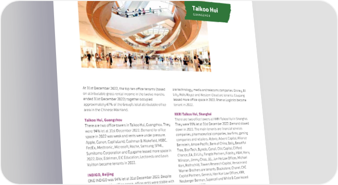 Taikoo Hui GUANGZHOU At 31st December 2022, the top ten office tenants (based are technology, media and telecoms companies. Disney, Eli on attributable gross rental income in the twelve months Lilly, Rolls Royce and Western Cloud are tenants. Coupang ended 31st December 2022) together occupied leased more office space in 2022. Rhenus Logistics became approximately 47% of the Group’s total attributable office tenant in 2022. area in the Chinese Mainland. HKRI Taikoo Hui, Shanghai Taikoo Hui, Guangzhou There are two office towers at HKRI Taikoo Hui in Shanghai. There are two office towers in Taikoo Hui, Guangzhou. They They were 99% let at 31st December 2022. Demand slowed were 94% let at 31st December 2022. Demand for office down in 2022. The main tenants are financial services space in 2022 was weak and rents were under pressure. companies, pharmaceutical companies, law firms, gaming Apple, Canon, CapitaLand, Cushman & Wakefield, HSBC, companies and retailers. Abbvie, Advent Capital, Alliance FedEx, Medtronic, Microsoft, Roche, Samsung, SFML, Bernstein, Amore Pacific, Bank of China, Bally, Beautiful Sumitomo Corporation and Eyugame leased more space in Tree, BionTech, Byredo, Canali, Citic Capital, Clifford 2022. Dior, Edelman, EIC Education, Lectoredu and Louis Chance, EA, Eli Lilly, Fangda Partners, Fidelity, H&M, Harry Vuitton became tenants in 2022. Winston, Jimmy Choo, JLL, Jun He Law Offices, Michael Kors, Rothschild, Towers Research Capital, Versace and INDIGO, Beijing Warner Brothers are tenants. Blackstone, Chanel, CVC ONE INDIGO was 94% let at 31st December 2022. Despite Capital Partners, Genesis, Han Kun Law Offices, KRR, weak demand for office space, office rents were stable with Neuberger Berman, Supercell and White & Case leased the limited new supply in the core areas. The main tenants more space in 2022. 53 SWIRE PROPERTIES ANNUAL REPORT 2022
