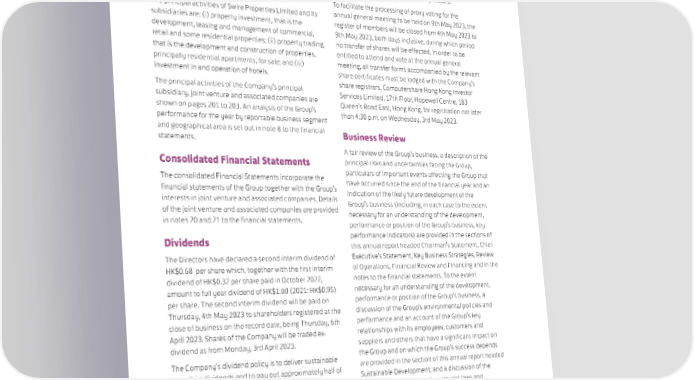 DIRECTORS’ REPORT The Directors submit their report together with the audited Company’s share registrars, Computershare Hong Kong financial statements for the year ended 31st December Investor Services Limited, 17th Floor, Hopewell Centre, 2022, which are set out on pages 134 to 203. 183 Queen’s Road East, Hong Kong, for registration not Principal Activities later than 4:30 p.m. on Tuesday, 4th April 2023. To facilitate the processing of proxy voting for the The principal activities of Swire Properties Limited and its annual general meeting to be held on 9th May 2023, the subsidiaries are: (i) property investment, that is the register of members will be closed from 4th May 2023 to development, leasing and management of commercial, 9th May 2023, both days inclusive, during which period retail and some residential properties; (ii) property trading, no transfer of shares will be effected. In order to be that is the development and construction of properties, entitled to attend and vote at the annual general principally residential apartments, for sale; and (iii) meeting, all transfer forms accompanied by the relevant investment in and operation of hotels. share certificates must be lodged with the Company’s The principal activities of the Company’s principal share registrars, Computershare Hong Kong Investor subsidiary, joint venture and associated companies are Services Limited, 17th Floor, Hopewell Centre, 183 shown on pages 201 to 203. An analysis of the Group’s Queen’s Road East, Hong Kong, for registration not later performance for the year by reportable business segment than 4:30 p.m. on Wednesday, 3rd May 2023. and geographical area is set out in note 8 to the financial Business Review statements. A fair review of the Group’s business, a description of the Consolidated Financial Statements principal risks and uncertainties facing the Group, The consolidated Financial Statements incorporate the particulars of important events affecting the Group that financial statements of the Group together with the Group’s have occurred since the end of the financial year and an interests in joint venture and associated companies. Details indication of the likely future development of the of the joint venture and associated companies are provided Group’s business (including, in each case to the extent in notes 20 and 21 to the financial statements. necessary for an understanding of the development, performance or position of the Group’s business, key Dividends performance indicators) are provided in the sections of this annual report headed Chairman’s Statement, Chief The Directors have declared a second interim dividend of Executive’s Statement, Key Business Strategies, Review HK$0.68 per share which, together with the first interim of Operations, Financial Review and Financing and in the dividend of HK$0.32 per share paid in October 2022, notes to the financial statements. To the extent amount to full year dividend of HK$1.00 (2021: HK$0.95) necessary for an understanding of the development, per share. The second interim dividend will be paid on performance or position of the Group’s business, a Thursday, 4th May 2023 to shareholders registered at the discussion of the Group’s environmental policies and close of business on the record date, being Thursday, 6th performance and an account of the Group’s key April 2023. Shares of the Company will be traded ex- relationships with its employees, customers and dividend as from Monday, 3rd April 2023. suppliers and others that have a significant impact on The Company’s dividend policy is to deliver sustainable the Group and on which the Group’s success depends growth in dividends and to pay out approximately half of are provided in the section of this annual report headed our underlying profit in ordinary dividends over time. Sustainable Development, and a discussion of the Group’s compliance with the relevant laws and Closure of Register of Members regulations that have a significant impact on the Group is provided in the sections of this annual report headed The register of members will be closed on Thursday, 6th Sustainable Development, Corporate Governance, Risk April 2023, during which day no transfer of shares will be Management and Directors’ Report. Detailed effected. In order to qualify for entitlement to the second information on the Group’s sustainability performance is interim dividend, all transfer forms accompanied by the provided in the Sustainable Development Report 2022. relevant share certificates must be lodged with the 114