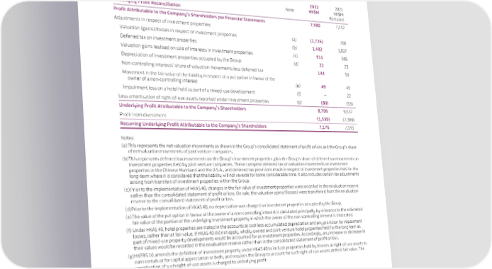 2022 2021 Note HK$M HK$M Underlying Profit Reconciliation Restated Profit Attributable to the Company’s Shareholders per Financial Statements 7,980 7,112 Adjustments in respect of investment properties: Valuation (gains)/losses in respect of investment properties (a) (1,726) 708 Deferred tax on investment properties (b) 1,402 1,027 Valuation gains realised on sale of interests in investment properties (c) 915 585 Depreciation of investment properties occupied by the Group (d) 22 23 Non-controlling interests’ share of valuation movements less deferred tax 144 59 Movement in the fair value of the liability in respect of a put option in favour of the owner of a non-controlling interest (e) 49 49 Impairment loss on a hotel held as part of a mixed-use development (f) – 22 Less amortisation of right-of-use assets reported under investment properties (g) (80) (53) Underlying Profit Attributable to the Company’s Shareholders 8,706 9,532 Profit from divestment (1,530) (2,389) Recurring Underlying Profit Attributable to the Company’s Shareholders 7,176 7,143 Notes: (a) This represents the net valuation movements as shown in the Group’s consolidated statement of profit or loss and the Group’s share of net valuation movements of joint venture companies. (b) This represents deferred tax movements on the Group’s investment properties, plus the Group’s share of deferred tax movements on investment properties held by joint venture companies. These comprise deferred tax on valuation movements on investment properties in the Chinese Mainland and the U.S.A., and deferred tax provisions made in respect of investment properties held for the long-term where it is considered that the liability will not reverse for some considerable time. It also includes certain tax adjustments arising from transfers of investment properties within the Group. (c) Prior to the implementation of HKAS 40, changes in the fair value of investment properties were recorded in the revaluation reserve rather than the consolidated statement of profit or loss. On sale, the valuation gains/(losses) were transferred from the revaluation reserve to the consolidated statement of profit or loss. (d) Prior to the implementation of HKAS 40, no depreciation was charged on investment properties occupied by the Group. (e) The value of the put option in favour of the owner of a non-controlling interest is calculated principally by reference to the estimated fair value of the portion of the underlying investment property in which the owner of the non-controlling interest is interested. (f) Under HKAS 40, hotel properties are stated in the accounts at cost less accumulated depreciation and any provision for impairment losses, rather than at fair value. If HKAS 40 did not apply, wholly-owned and joint venture hotel properties held for the long term as part of mixed-use property developments would be accounted for as investment properties. Accordingly, any increase or decrease in their values would be recorded in the revaluation reserve rather than in the consolidated statement of profit or loss. (g) HKFRS 16 amends the definition of investment property under HKAS 40 to include properties held by lessees as right-of-use assets to earn rentals or for capital appreciation or both, and requires the Group to account for such right-of-use assets at their fair value. The amortisation of such right-of-use assets is charged to underlying profit. 33 SWIRE PROPERTIES ANNUAL REPORT 2022