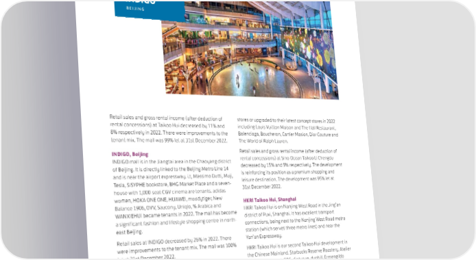 MANAGEMENT DISCUSSION & ANALYSIS | REVIEW OF OPERATIONS INDIGO BEIJING Retail sales and gross rental income (after deduction of stores or upgraded to their latest concept stores in 2022 rental concessions) at Taikoo Hui decreased by 11% and including Louis Vuitton Maison and The Hall Restaurant, 8% respectively in 2022. There were improvements to the Balenciaga, Boucheron, Cartier Masion, Dior Couture and tenant mix. The mall was 99% let at 31st December 2022. The World of Ralph Lauren. INDIGO, Beijing Retail sales and gross rental income (after deduction of INDIGO mall is in the Jiangtai area in the Chaoyang district rental concessions) at Sino-Ocean Taikoo Li Chengdu of Beijing. It is directly linked to the Beijing Metro Line 14 decreased by 15% and 9% respectively. The development and is near the airport expressway. i.t, Massimo Dutti, Muji, is reinforcing its position as a premium shopping and Tesla, SISYPHE bookstore, BHG Market Place and a seven- leisure destination. The development was 95% let at house with 1,000-seat CGV cinema are tenants. adidas 31st December 2022. women, HOKA ONE ONE, HUAWEI, moodytiger, New HKRI Taikoo Hui, Shanghai Balance 1906, OVV, Saucony, Uniqlo, % Arabica and HKRI Taikoo Hui is on Nanjing West Road in the Jing’an WANXIEHUI became tenants in 2022. The mall has become district of Puxi, Shanghai. It has excellent transport a significant fashion and lifestyle shopping centre in north- connections, being next to the Nanjing West Road metro east Beijing. station (which serves three metro lines) and near the Retail sales at INDIGO decreased by 26% in 2022. There Yan’an Expressway. were improvements to the tenant mix. The mall was 100% HKRI Taikoo Hui is our second Taikoo Hui development in let at 31st December 2022. the Chinese Mainland. Starbucks Reserve Roastery, Atelier Sino-Ocean Taikoo Li Chengdu Cologne, Bremont, COS, diptyque, dunhill, Ermengildo Sino-Ocean Taikoo Li Chengdu is in the Jinjiang district of Zegna, Guerlain, Golden Goose, IWC, i.t, Kenzo, Lululemon, Chengdu and is part of the Chunxi Road/Daci Temple MARNI MARKET, Max Mara, Nio, SPACE, Tesla, The shopping district. It is our second Taikoo Li project in the Cheesecake Factory, Shanghai Club, Ho Hung Kee and a Chinese Mainland. Apple, Balenciaga, Gucci, Dior, Hermès, city’super supermarket are tenants. CANADA GOOSE, I.T, Tiffany & Co., Muji, Fangsuo bookstore, Olé Supermarket drivepro lab, FIVE GUYS, Fook Luk House, GAGA, LOEWE, and a 1,720-seat Palace-j’aime cinema are tenants. Despite MOOSE KNUCKLES, self-portrait, Theory, UNDEFEATED and COVID-19 resurgence in Chengdu, 85 brands opened new Venchi became tenants in 2022. 50