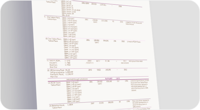 SCHEDULE OF PRINCIPAL GROUP PROPERTIES At 31st December 2022 Completed properties for Leasehold Site area in Gross floor area Number of Year of investment in Hong Kong Lot number expiry square feet in square feet car parks completion Remarks Office (continued) 7. Cambridge House, QBML 1 sE ss2 (part) 2881 70,414 268,795 – 2003 Linked to Devon House. Taikoo Place QBML 1 sF ss1 (part) (part) QBML 1 sF RP (part) ML 703 sN (part) 8. One Island East, QBML 1 sC ss5 2881/2899 109,929 1,537,011 – 2008 Taikoo Place QBML 1 sC ss6 QBML 2 & Ext. sF QBML 2 & Ext. sG QBML 2 & Ext. sH ss6 sB RP QBML 2 & Ext. sH RP QBML 2 & Ext. RP QBIL 15 sD 9. One Taikoo Place, QBML 1 sQ (part) 2881 238,582 1,013,368 82 2018 Linked to Lincoln House and Taikoo Place QBML 1 sR ss1 (part) (part) Oxford House. QBML 1 sR RP (part) QBML 1 sS (part) QBML 1 sT ss1 (part) QBML 1 sT ss2 (part) QBML 1 sT RP (part) QBML 1 sU (part) QBML 1 sW (part) QBML 1 RP (part) 10. Two Taikoo Place, QBML 1 sQ (part) 2881 238,582 994,545 346 2022 Linked to PCCW Tower. Taikoo Place QBML 1 sR ss1 (part) (part) QBML 1 sR RP (part) QBML 1 sS (part) QBML 1 sT ss1 (part) QBML 1 sT ss2 (part) QBML 1 sT RP (part) QBML 1 sU (part) QBML 1 sW (part) QBML 1 RP (part) 11. SPACES. 8QRE, IL 5250 2089/ 4,612 81,346 – 2013 With ground floor retail. 8 Queen’s IL 7948 2103/2113 (Refurbishment) Road East, IL 7950 Wan Chai 12. 28 Hennessy Road ML 23 2843 9,622 145,390 – 2012 (will be renamed as IL 2244 RP Five Pacific Place), IL 2245 RP Wan Chai Total held through subsidiaries 8,474,662 1,411 13. PCCW Tower, QBML 1 sQ (part) 2881 238,582 620,148 217 1994 Linked to Dorset House, Lincoln Taikoo Place QBML 1 sR ss1 (part) (part) House and Two Taikoo Place. QBML 1 sR RP (part) Floor area shown represents QBML 1 sS (part) the whole development, in QBML 1 sT ss1 (part) which the Group owns a 50% QBML 1 sT ss2 (part) interest. QBML 1 sT RP (part) QBML 1 sU (part) QBML 1 sW (part) QBML 1 RP (part) 14. Berkshire House, IL 8854 2047 25,926 388,838 84 1998 Floor area shown represents Taikoo Place the whole development, in which the Group owns a 50% interest. 15. One Citygate, TCTL 2 (part) 2047 358,557 160,522 63 1999/ Above Citygate Outlets. Floor Tung Chung, (part) 2000 area shown represents the Lantau whole of the office area of the development, in which the Group owns a 26.67% interest. 16. South Island Place, AIL 461 RP 2064 25,260 382,499 137 2018 Floor area shown represents Wong Chuk Hang the whole development, in which the Group owns a 50% interest. Total held through joint venture companies 1,552,007 501 – of which attributable to the Group 738,548 206
