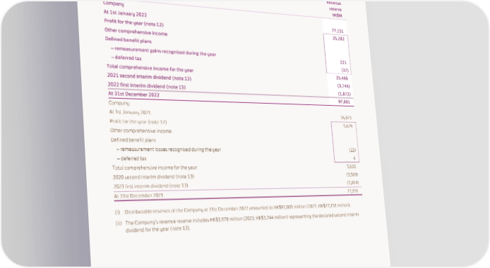 37. Company Statement of Financial Position and Reserves (continued) (b) The movement of the Company reserves during the year are as follows: Revenue reserve HK$M Company At 1st January 2022 77,151 Profit for the year (note 12) 25,282 Other comprehensive income Defined benefit plans – remeasurement gains recognised during the year 221 – deferred tax (37) Total comprehensive income for the year 25,466 2021 second interim dividend (note 13) (3,744) 2022 first interim dividend (note 13) (1,872) At 31st December 2022 97,001 Company At 1st January 2021 76,923 Profit for the year (note 12) 5,629 Other comprehensive income Defined benefit plans – remeasurement losses recognised during the year (22) – deferred tax 4 Total comprehensive income for the year 5,611 2020 second interim dividend (note 13) (3,569) 2021 first interim dividend (note 13) (1,814) At 31st December 2021 77,151 (i) Distributable reserves of the Company at 31st December 2022 amounted to HK$97,001 million (2021: HK$77,151 million). (ii) The Company’s revenue reserve includes HK$3,978 million (2021: HK$3,744 million) representing the declared second interim dividend for the year (note 13). SWIRE PROPERTIES ANNUAL REPORT 2022 191