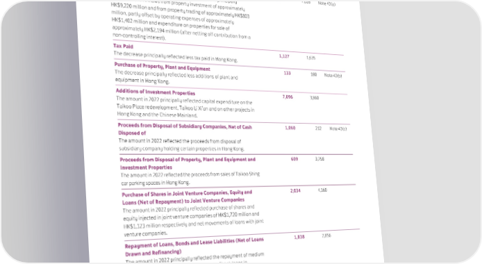 Consolidated Statement of Cash Flows 2022 2021 HK$M HK$M Reference Cash Generated from Operations 6,332 7,028 Note 43(a) Cash generated from operations of HK$6,332 million principally comprised cash inflows from property investment of approximately HK$9,220 million and from property trading of approximately HK$803 million, partly offset by operating expenses of approximately HK$1,402 million and expenditure on properties for sale of approximately HK$2,194 million (after netting off contribution from a non-controlling interest). Tax Paid 1,127 1,635 The decrease principally reflected less tax paid in Hong Kong. Purchase of Property, Plant and Equipment 133 180 Note 43(b) The decrease principally reflected less additions of plant and equipment in Hong Kong. Additions of Investment Properties 7,096 3,860 The amount in 2022 principally reflected capital expenditure on the Taikoo Place redevelopment, Taikoo Li Xi’an and on other projects in Hong Kong and the Chinese Mainland. Proceeds from Disposal of Subsidiary Companies, Net of Cash 1,060 212 Note 43(c) Disposed of The amount in 2022 reflected the proceeds from disposal of subsidiary company holding certain properties in Hong Kong. Proceeds from Disposal of Property, Plant and Equipment and 609 3,758 Investment Properties The amount in 2022 reflected the proceeds from sales of Taikoo Shing car parking spaces in Hong Kong. Purchase of Shares in Joint Venture Companies, Equity and 2,034 4,160 Loans (Net of Repayment) to Joint Venture Companies The amount in 2022 principally reflected purchase of shares and equity injected in joint venture companies of HK$1,720 million and HK$1,123 million respectively and net movements of loans with joint venture companies. Repayment of Loans, Bonds and Lease Liabilities (Net of Loans 1,838 2,856 Drawn and Refinancing) The amount in 2022 principally reflected the repayment of medium term notes, partly offset by the drawdown of bank loans in Hong Kong. 79 SWIRE PROPERTIES ANNUAL REPORT 2022