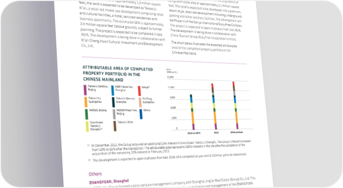Taikoo Li Xi’an Sanya In March 2022, a consortium in which the Group has a 70% In October 2022, a consortium in which the Group has a interest acquired (via a government land tender) the land 50% interest acquired (via a government land tender) the use rights in respect of land in the Small Wild Goose land use rights in respect of land in the Haitang district of Pagoda historical and cultural zone in the Beilin district of Sanya with a site area of approximately 2.1 million square Xi’an. With a site area of approximately 1.3 million square feet. The land is expected to be developed into a premium, feet, the land is expected to be developed as Taikoo Li resort-style, retail-led development including underground Xi’an, a retail-led mixed-use development comprising retail parking and other ancillary facilities. The development will and cultural facilities, a hotel, serviced residences and be Phase III of the Sanya International Duty-Free Complex. business apartments. The estimated GFA is approximately The project is expected to open in phases from late 2024. 2.4 million square feet (above ground), subject to further The development is being done in collaboration with planning. The project is expected to be completed in late China Tourism Group Duty Free Corporation Limited. 2025. The development is being done in collaboration with The chart below illustrates the expected attributable Xi’an Cheng Huan Cultural Investment and Development area of the completed property portfolio in the Co., Ltd. Chinese Mainland. ATTRIBUTABLE AREA OF COMPLETED GFA PROPERTY PORTFOLIO IN THE (000 sq. ft.) CHINESE MAINLAND 15,000 Taikoo Li Sanlitun, ‡ˆ Taikoo ui, San‰a(2) 12,000 Beiin Sanai Taikoo ui, Taikoo Li †iantan, ui Fan, 9,000 Guanou Sanai Guanou G€, Beiin G€ Žase T‘o, €teŒs 6,000 Beiin 3,000 Sino‚€ƒean Taikoo Li Ši’an Taikoo Li (1) „en…u 0 2023 to 2024 2025 2026 and later (1) In December 2022, the Group acquired an additional 15% interest in Sino-Ocean Taikoo Li Chengdu. The Group’s interest increased from 50% to 65% after the transaction. The attributable area represents 100% interests in the site after the completion of the acquisition of the remaining 35% interest in February 2023. (2) The development is expected to open in phases from late 2024. GFA completed at year end of 2024 has yet to be determined. Others ZHANGYUAN, Shanghai In 2021, the Group formed a joint venture management company with Shanghai Jing’an Real Estate (Group) Co., Ltd. This company, in which the Group has a 60% interest, is engaged in the revitalisation and management of the ZHANGYUAN Shikumen compound in the Jing’an district of Shanghai. When the revitalisation is completed, the compound will have a GFA (including car parking spaces) of 591,189 square feet above ground and 738,066 square feet underground. There are over 40 Shikumen blocks, with about 170 two or three-storey houses. There are connections to three metro lines and to HKRI Taikoo Hui. The first phase (the West zone) was completed and opened in November 2022. Construction and renovation at the second phase (the East zone) are in progress. The second phase is planned to be completed and opened in 2026. The Group does not have an ownership interest in the compound. SWIRE PROPERTIES ANNUAL REPORT 2022 55
