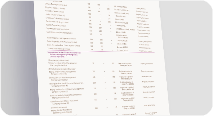 PRINCIPAL SUBSIDIARY, JOINT VENTURE AND ASSOCIATED COMPANIES Showing proportion of capital owned at 31st December 2022 Owned Attributable Owned by to the Group directly subsidiaries Issued and fully paid up % % % shares/Registered capital Principal activities Subsidiary companies: Incorporated in Hong Kong with limited liability and operating in Hong Kong: Achieve Bright Limited 100 100 – 100 shares (HK$100) Property trading Citiluck Development Limited 100 – 100 1,000 shares (HK$1,000) Property investment Cityplaza Holdings Limited 100 100 – 100 shares (HK$1,000) Property investment Coventry Estates Limited 100 – 100 4 shares (HK$40) Property investment Joyful Sincere Limited (d) 80 – 100 1 share (HK$1) Property trading One Queen’s Road East Limited 100 – 100 200 shares (HK$200) Property investment Pacific Place Holdings Limited 100 100 – 2 shares (HK$2) Property investment Redhill Properties Limited 100 100 – 250,000 shares (HK$7,300,000) Property investment Super Gear Investment Limited 100 100 – 2 shares (HK$2) Property investment Swire Properties (Finance) Limited 100 100 – 1,000,000 shares Financial services (HK$1,000,000) Swire Properties Management Limited 100 100 – 2 shares (HK$20) Property management Swire Properties MTN Financing Limited 100 100 – 1 share (HK$1) Financial services Swire Properties Real Estate Agency Limited 100 100 – 2 shares (HK$20) Real estate agency Taikoo Place Holdings Limited 100 100 – 2 shares (HK$2) Property investment Incorporated in the Chinese Mainland with limited liability and operating in the Chinese Mainland: (Sino-foreign joint venture) Taikoo Hui (Guangzhou) Development 97 – 97 Registered capital of Property investment Company Limited (b) RMB3,050,000,000 (Wholly foreign owned enterprises) Beijing Anye Property Management 100 – 100 Registered capital of Property Investment Company Limited (b) RMB209,500,000 Beijing Sanlitun Hotel Management 100 – 100 Registered capital of Hotel investment Company Limited (b) RMB800,000,000 Beijing Sanlitun North Property Management 100 – 100 Registered capital of Property investment Company Limited (b) RMB2,784,000,000 Beijing Sanlitun South Property Management 100 – 100 Registered capital of Property investment Company Limited (b) RMB1,598,000,000 Sunshine Melody (Guangzhou) Properties 100 – 100 Registered capital of Property investment Management Limited RMB295,000,000 Swire Properties (China) Investment 100 – 100 Registered capital of Holding company Company Limited (b) US$30,000,000 (Domestic company) Beijing Tianlian Real Estate 100 – 100 Registered capital of Holding company Company Limited (b)(d) RMB865,000,000 (Sino-foreign owned enterprises) Xi’an Tengyun Real Estate Company Limited (b) 70 – 70 Registered capital of Property trading and RMB3,653,743,600 investment Notes: (a) This table lists the principal subsidiary, joint venture and associated companies of the Group including those which, in the opinion of the Directors, materially contribute to the net income of the Group or hold a material portion of the assets or liabilities of the Group. To give full details of these companies would, in the opinion of the Directors, result in particulars of excessive length. (b) Translated name. (c) Group interest held through joint venture and associated companies. (d) Companies the accounts of which are not audited by PricewaterhouseCoopers. These companies accounted for approximately 2.0% of attributable net assets at 31st December 2022. SWIRE PROPERTIES ANNUAL REPORT 2022 201