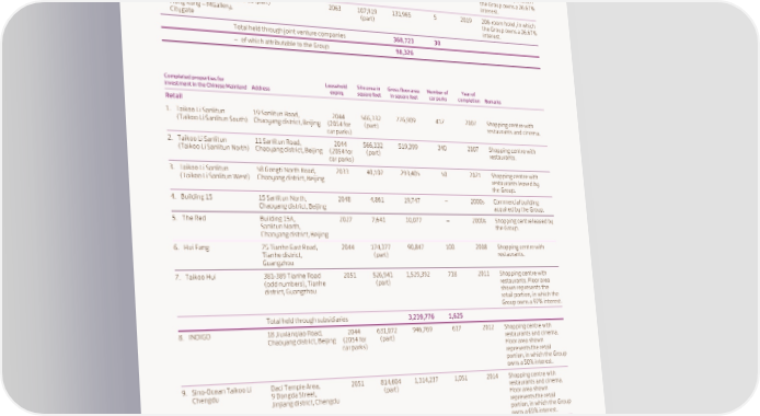 Completed properties for Leasehold Site area in Gross floor area Number of Year of investment in Hong Kong Lot number expiry square feet in square feet car parks completion Remarks Hotel (continued) 6. Novotel Citygate TCTL 2 (part) 2047 358,557 236,758 25 2005 440-room hotel, in which Hong Kong, (part) the Group owns a 26.67% Citygate interest. 7. The Silveri TCTL 11 (part) 2063 107,919 131,965 5 2019 206-room hotel, in which Hong Kong – MGallery, (part) the Group owns a 26.67% Citygate interest. Total held through joint venture companies 368,723 30 – of which attributable to the Group 98,326 Completed properties for Leasehold Site area in Gross floor area Number of Year of investment in the Chinese Mainland Address expiry square feet in square feet car parks completion Remarks Retail 1. Taikoo Li Sanlitun 19 Sanlitun Road, 2044 566,332 776,909 417 2007 Shopping centre with (Taikoo Li Sanlitun South) Chaoyang district, Beijing (2054 for (part) restaurants and cinema. car parks) 2. Taikoo Li Sanlitun 11 Sanlitun Road, 2044 566,332 519,399 340 2007 Shopping centre with (Taikoo Li Sanlitun North) Chaoyang district, Beijing (2054 for (part) restaurants. car parks) 3. Taikoo Li Sanlitun 58 Gongti North Road, 2033 40,102 293,405 50 2021 Shopping centre with (Taikoo Li Sanlitun West) Chaoyang district, Beijing restaurants leased by the Group. 4. Building 15 15 Sanlitun North, 2048 4,861 19,747 – 2000s Commercial building Chaoyang district, Beijing acquired by the Group. 5. The Red Building 15A, 2027 7,641 10,077 – 2000s Shopping centre leased by Sanlitun North, the Group. Chaoyang district, Beijing 6. Hui Fang 75 Tianhe East Road, 2044 174,377 90,847 100 2008 Shopping centre with Tianhe district, (part) restaurants. Guangzhou 7. Taikoo Hui 381-389 Tianhe Road 2051 526,941 1,529,392 718 2011 Shopping centre with (odd numbers), Tianhe (part) restaurants. Floor area district, Guangzhou shown represents the retail portion, in which the Group owns a 97% interest. Total held through subsidiaries 3,239,776 1,625 8. INDIGO 18 Jiuxianqiao Road, 2044 631,072 946,769 617 2012 Shopping centre with Chaoyang district, Beijing (2054 for (part) restaurants and cinema. car parks) Floor area shown represents the retail portion, in which the Group owns a 50% interest. 9. Sino-Ocean Taikoo Li Daci Temple Area, 2051 814,604 1,314,237 1,051 2014 Shopping centre with Chengdu 9 Dongda Street, (part) restaurants and cinema. Jinjiang district, Chengdu Floor area shown represents the retail portion, in which the Group owns a 65% interest. 10. Heritage Buildings Daci Temple Area, 2034 N/A 40,387 – 2014 Heritage Buildings leased in Sino-Ocean 9 Dongda Street, (part) from the local government Taikoo Li Chengdu Jinjiang district, Chengdu as part of the retail operation of Sino-Ocean Taikoo Li Chengdu, in which the Group owns a 65% interest. 11. HKRI Taikoo Hui South of West Nanjing 2049 676,091 1,105,646 240 2016 Floor area shown Road and east of Shi Men (part) represents the retail Yi Road, Jing’an district, portion, in which the Group Shanghai owns a 50% interest. SWIRE PROPERTIES ANNUAL REPORT 2022 209