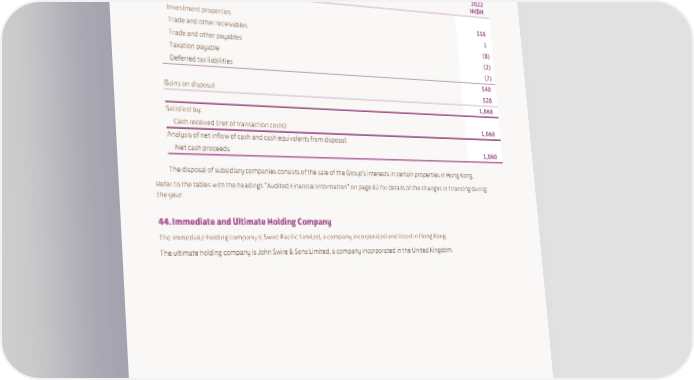 43. Notes to the Consolidated Statement of Cash Flows (continued) (c) Disposal of subsidiary companies 2022 HK$M Net assets disposed of: Investment properties 556 Trade and other receivables 1 Trade and other payables (8) Taxation payable (2) Deferred tax liabilities (7) 540 Gains on disposal 520 1,060 Satisfied by: Cash received (net of transaction costs) 1,060 Analysis of net inflow of cash and cash equivalents from disposal: Net cash proceeds 1,060 The disposal of subsidiary companies consists of the sale of the Group’s interests in certain properties in Hong Kong. Refer to the tables with the headings “Audited Financial Information” on page 82 for details of the changes in financing during the year. 44. Immediate and Ultimate Holding Company The immediate holding company is Swire Pacific Limited, a company incorporated and listed in Hong Kong. The ultimate holding company is John Swire & Sons Limited, a company incorporated in the United Kingdom. SWIRE PROPERTIES ANNUAL REPORT 2022 197