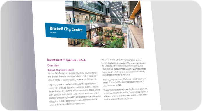 MANAGEMENT DISCUSSION & ANALYSIS | REVIEW OF OPERATIONS Brickell City Centre MIAMI Investment Properties – U.S.A. The Group owns 62.93% of the shopping centre at the Overview Brickell City Centre development. The remaining interest in the shopping centre is owned by Simon Property Group Brickell City Centre, Miami (25%) and Bal Harbour Shops (12.07%). Bal Harbour Shops Brickell City Centre is an urban mixed-use development in has an option, which has been exercisable since February the Brickell financial district of Miami, U.S.A. It has a site 2020, to sell its interest to the Group. area of 504,017 square feet (approximately 11.6 acres). The shopping centre was 89% leased (including by way of The first phase of the Brickell City Centre development letters of intent) at 31st December 2022. Retail sales in comprises a shopping centre, two office towers (Two and 2022 increased by 24%. Three Brickell City Centre, which were sold in 2020), a hotel The second phase of the Brickell City Centre development, with serviced apartments (EAST Miami, which was sold in to be known as One Brickell City Centre, is being planned. It 2021) managed by Swire Hotels and two residential towers will be a commercial development and will be connected to (Reach and Rise) developed for sale. All the residential the first phase of Brickell City Centre. units at Reach and Rise have been sold. 56