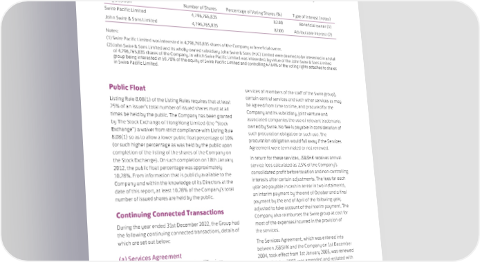 CORPORATE GOVERNANCE & SUSTAINABILITY | DIRECTORS’ REPORT Substantial Shareholders’ and Other Interests The register of interests in shares and short positions maintained under Section 336 of the SFO shows that at 31st December 2022 the Company had been notified of the following interests in the shares of the Company held by substantial shareholders and other persons: Long position Number of Shares Percentage of Voting Shares (%) Type of Interest (notes) Swire Pacific Limited 4,796,765,835 82.00 Beneficial owner (1) John Swire & Sons Limited 4,796,765,835 82.00 Attributable interest (2) Notes: (1) Swire Pacific Limited was interested in 4,796,765,835 shares of the Company as beneficial owner. (2) John Swire & Sons Limited and its wholly-owned subsidiary John Swire & Sons (H.K.) Limited were deemed to be interested in a total of 4,796,765,835 shares of the Company, in which Swire Pacific Limited was interested, by virtue of the John Swire & Sons Limited group being interested in 59.78% of the equity of Swire Pacific Limited and controlling 67.64% of the voting rights attached to shares in Swire Pacific Limited. Public Float services of members of the staff of the Swire group), Listing Rule 8.08(1) of the Listing Rules requires that at least certain central services and such other services as may 25% of an issuer’s total number of issued shares must at all be agreed from time to time, and procured for the times be held by the public. The Company has been granted Company and its subsidiary, joint venture and by The Stock Exchange of Hong Kong Limited (the “Stock associated companies the use of relevant trademarks Exchange”) a waiver from strict compliance with Listing Rule owned by Swire. No fee is payable in consideration of 8.08(1) so as to allow a lower public float percentage of 10% such procuration obligation or such use. The (or such higher percentage as was held by the public upon procuration obligation would fall away if the Services completion of the listing of the shares of the Company on Agreement were terminated or not renewed. the Stock Exchange). On such completion on 18th January In return for these services, JS&SHK receives annual 2012, the public float percentage was approximately service fees calculated as 2.5% of the Company’s 10.28%. From information that is publicly available to the consolidated profit before taxation and non-controlling Company and within the knowledge of its Directors at the interests after certain adjustments. The fees for each date of this report, at least 10.28% of the Company’s total year are payable in cash in arrear in two instalments, number of issued shares are held by the public. an interim payment by the end of October and a final payment by the end of April of the following year, Continuing Connected Transactions adjusted to take account of the interim payment. The Company also reimburses the Swire group at cost for During the year ended 31st December 2022, the Group had most of the expenses incurred in the provision of the following continuing connected transactions, details of the services. which are set out below: The Services Agreement, which was entered into (a) Services Agreement between JS&SHK and the Company on 1st December There is an agreement for services (“Services 2004, took effect from 1st January 2005, was renewed Agreement”), in respect of which John Swire & Sons on 1st October 2007, was amended and restated with (H.K.) Limited (“JS&SHK”), a wholly-owned subsidiary effect from 1st January 2010, was renewed again on of John Swire & Sons Limited (“Swire”), provided to the 1st October 2010, 14th November 2013 and 1st Company and its subsidiaries advice and expertise of October 2016, was amended and restated on 9th the directors and senior officers of the Swire group, August 2019 and was renewed again on 1st October including (but not limited to) assistance in negotiating 2019 and 1st October 2022. The current term of the with regulatory and other governmental or official Services Agreement is from 1st January 2023 to 31st bodies, certain staff services (including full or part time December 2025 and it is renewable for successive 118