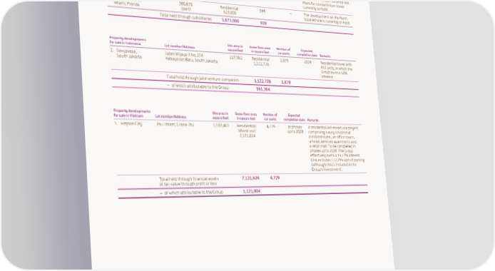 SCHEDULE OF PRINCIPAL GROUP PROPERTIES At 31st December 2022 Property developments for sale Gross floor area Number of Expected in the United States Site area in square feet in square feet car parks completion date Remarks 1. South Brickell Key, 105,372 Residential: 395 – Development site in central Miami, Florida 550,000 Miami acquired in January 1997 along with Mandarin Oriental site. Plans for condominium tower currently on hold. 2. North Squared, 380,670 Residential: 544 – The development on the North Miami, Florida (part) 523,000 Squared site is currently on hold. Total held through subsidiaries 1,073,000 939 Property developments Site area in Gross floor area Number of Expected for sale in Indonesia Lot number/Address square feet in square feet car parks completion date Remarks 1. Savyavasa, Jalan Wijaya II No.37A 227,982 Residential: 1,079 2024 Residential tower with South Jakarta Kebayoran Baru, South Jakarta 1,122,728 433 units, in which the Group owns a 50% interest. Total held through joint venture companies 1,122,728 1,079 – of which attributable to the Group 561,364 Property developments Site area in Gross floor area Number of Expected for sale in Vietnam Lot number/Address square feet in square feet car parks completion date Remarks 1. Empire City Thu Thiem, (Zone 2b) 1,103,461 Residential/ 4,729 In phases A residential-led mixed-use project Mixed-use: up to 2028 comprising luxury residential 7,131,624 condominiums, an office tower, a hotel, serviced apartments and a retail mall. To be completed in phases up to 2028. The Group effectively owns a 15.73% interest. GFA excludes 172,295 sqm of parking (although this is included in the Group’s investment). Total held through financial assets 7,131,624 4,729 at fair value through profit or loss – of which attributable to the Group 1,121,804 214