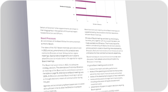 OTHER LISTED COMPANY DIRECTORSHIPS 2 Number of Companies 1 0 0 2 4 6 8 Number of Directors Details of Directors’ other appointments are shown in Board decisions are made by vote at Board meetings and their biographies in the section of this annual report supplemented by the circulation of written resolutions headed Directors and Officers. between Board meetings. Board Processes Minutes of Board meetings are taken by the Company All committees of the Board follow the same processes Secretary and, together with any supporting papers, are as the full Board. made available to all Directors. The minutes record the matters considered by the Board, the decisions reached, The dates of the 2022 Board meetings were determined and any concerns raised or dissenting views expressed by in 2021 and any amendments to this schedule were Directors. Draft and final versions of the minutes are sent to notified to Directors at least 14 days before regular all Directors for their comment and records respectively. meetings. Appropriate arrangements are in place to Board meetings are structured so as to encourage open allow Directors to include items in the agenda for regular discussion, frank debate and active participation by Board meetings. Directors in meetings. The Board met seven times in 2022, including two A typical Board meeting would consist of: strategy sessions. The attendance of individual Directors at meetings of the Board and its committees is set out in • review of the health and safety performance the table on page 96. Attendance at Board meetings was • review of the operating environment for the business 100%. All Directors attended Board meetings in person and of the most recent financial results and outlook or through electronic means of communication during • review of the development progress of new investments the year. • review and discussion of longer term financial plans, Agendas and accompanying Board papers are circulated including a discussion of capital allocation and with sufficient time to allow the Directors to prepare investment plans before meetings. • presentation of papers to support decisions requiring Board approval The Chairman takes the lead to ensure that the Board • an update on sustainability and ESG matters acts in the best interests of the Company, that there is • an update of legal and compliance matters for the effective communication with the shareholders and that Board’s consideration their views are communicated to the Board as a whole. • any declarations of interest 95 SWIRE PROPERTIES ANNUAL REPORT 2022