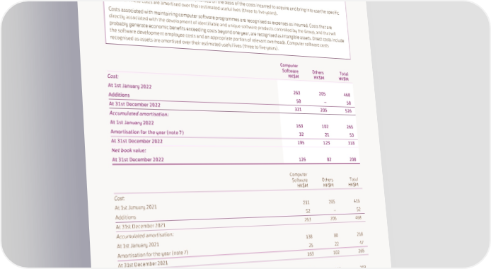 17. Intangible Assets Accounting Policy Computer software Computer software licences acquired are capitalised on the basis of the costs incurred to acquire and bring into use the specific software. These costs are amortised over their estimated useful lives (three to five years). Costs associated with maintaining computer software programmes are recognised as expenses as incurred. Costs that are directly associated with the development of identifiable and unique software products controlled by the Group, and that will probably generate economic benefits exceeding costs beyond one year, are recognised as intangible assets. Direct costs include the software development employee costs and an appropriate portion of relevant overheads. Computer software costs recognised as assets are amortised over their estimated useful lives (three to five years). Computer Software Others Total HK$M HK$M HK$M Cost: At 1st January 2022 263 205 468 Additions 58 – 58 At 31st December 2022 321 205 526 Accumulated amortisation: At 1st January 2022 163 102 265 Amortisation for the year (note 7) 32 21 53 At 31st December 2022 195 123 318 Net book value: At 31st December 2022 126 82 208 Computer Software Others Total HK$M HK$M HK$M Cost: At 1st January 2021 211 205 416 Additions 52 – 52 At 31st December 2021 263 205 468 Accumulated amortisation: At 1st January 2021 138 80 218 Amortisation for the year (note 7) 25 22 47 At 31st December 2021 163 102 265 Net book value: At 31st December 2021 100 103 203 Amortisation of HK$53 million (2021: HK$47 million) is included in cost of sales and administrative expenses in the consolidated statement of profit or loss. SWIRE PROPERTIES ANNUAL REPORT 2022 163