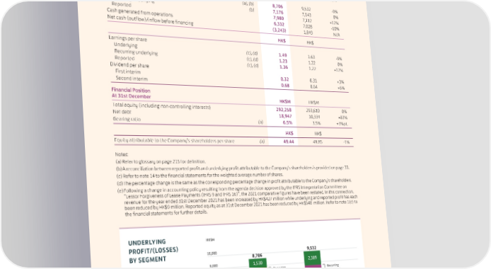 FINANCIAL HIGHLIGHTS 2022 2021(e) Results Note HK$M HK$M Change For the year Restated Revenue 13,826 16,318 -15% Profit attributable to the Company’s shareholders Underlying (a), (b) 8,706 9,532 -9% Recurring underlying (b) 7,176 7,143 0% Reported 7,980 7,112 +12% Cash generated from operations 6,332 7,028 -10% Net cash (outflow)/inflow before financing (3,243) 1,849 N/A HK$ HK$ Earnings per share Underlying (c), (d) 1.49 1.63 -9% Recurring underlying (c), (d) 1.23 1.22 0% Reported (c), (d) 1.36 1.22 +12% Dividend per share First interim 0.32 0.31 +3% Second interim 0.68 0.64 +6% Financial Position At 31st December HK$M HK$M Total equity (including non-controlling interests) 292,258 293,610 0% Net debt 18,947 10,334 +83% Gearing ratio (a) 6.5% 3.5% +3%pt. HK$ HK$ Equity attributable to the Company’s shareholders per share (a) 49.44 49.85 -1% Notes: (a) Refer to glossary on page 215 for definition. (b) A reconciliation between reported profit and underlying profit attributable to the Company’s shareholders is provided on page 33. (c) Refer to note 14 to the financial statements for the weighted average number of shares. (d) The percentage change is the same as the corresponding percentage change in profit attributable to the Company’s shareholders. (e) Following a change in accounting policy resulting from the agenda decision approved by the IFRS Interpretation Committee on “Lessor Forgiveness of Lease Payments (IFRS 9 and IFRS 16)”, the 2021 comparative figures have been restated. In this connection, revenue for the year ended 31st December 2021 has been increased by HK$427 million while underlying and reported profit has each been reduced by HK$9 million. Reported equity as at 31st December 2021 has been reduced by HK$548 million. Refer to note 1(c) to the financial statements for further details. UNDERLYING HK$M PROFIT/LOSSES BY SEGMENT 10,000 8,706 9,532 8,000 1,530 2,389 Property in etent 108 erring erring 6,000 nderying nderying proit proit Property trading 7,176 7,143 4,000 7,409 7,482 Hote 2,000 €i etent 0 (341) (45) -2,000 (294) 2022 2021 (etated) 16