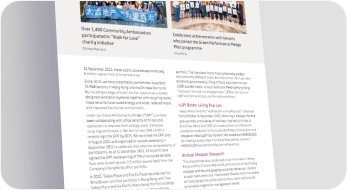 Over 1,400 Community Ambassadors Celebrated achievements with tenants participated in “Walk for Love” who joined the Green Performance Pledge charity initiative Pilot programme Chinese Mainland Hong Kong 31 December 2022, these audits covered approximately portfolio. The five urban farms have collectively yielded 6 million square feet of tenanted area. approximately 500 kg of crops. As of December 2022, we have Since 2019, we have presented Green Kitchen Awards to donated approximately 275 kg of food, equivalent to over 76 F&B tenants in Hong Kong and the Chinese Mainland. 3,600 packed meals, to local food bank Feeding Hong Kong. By installing energy-efficient kitchen appliances and well- The Loop initiative has engaged over 1,350 of our tenants’ designed ventilation systems together with recycling waste, staff via the Farm Club, events and workshops. these tenants have saved energy and water, reduced waste +UP! Better Living Pop-ups and improved the kitchen environment. Taikoo Place held the “+UP! Better Living Pop-ups” campaign Under our Green Performance Pledge (“GPP”), we have from October to November 2022, featuring a lifestyle-themed been collaborating with office tenants on fit-out and pop-up shop and a series of wellness-inspired activities at operations to improve their energy, water and waste ArtisTree. More than 350 office executives from 18 tenant recycling performance. We aim to have 50% of office companies took part in the corporate 8-Hour Charity Spin and tenants sign the GPP by 2025. We launched the GPP pilot inaugural indoor golf tournament. We raised over HK$508,000 in August 2021 and organised an awards ceremony in for charity Laureus Sport for Good Foundation, of which September 2022 to celebrate the collective achievements of HK$350,000 was donated by Swire Properties. participants. As at 31 December 2022, 52 tenants have signed the GPP, representing 37.9% of occupied lettable Annual Shopper Research floor area (covering over 2.5 million square feet) from the This programme was conducted at our nine malls in Hong Company’s Hong Kong office portfolio. Kong and the Chinese Mainland, with the aim of identifying In 2022, Taikoo Place and Pacific Place became the first shopper profiles and gauging customer behaviour. Visitors WiredScore-certified portfolios in Hong Kong, with Two to peer malls were also interviewed. Results from the studies Taikoo Place and Six Pacific Place being the first buildings will help gauge the performance of our malls and provide in Hong Kong to be both WiredScore and SmartScore actionable insights for management teams. Platinum certified. Performance (Environment) PROJECT AFTER 6 As a leading property developer, we are committed to We hosted five music performances in 2022, reaching over building and managing our developments sustainably. 1,100 of our tenants’ staff from 71 companies. Climate Change The Loop In 2022, we continued to progress steadily towards our This year, we expanded The Loop urban farms to One Pacific 1.5°C-aligned science-based targets, as part of our core Place, making it the fifth farm in our Hong Kong office strategy to reach net-zero emissions by 2050. This year, 125 SWIRE PROPERTIES ANNUAL REPORT 2022