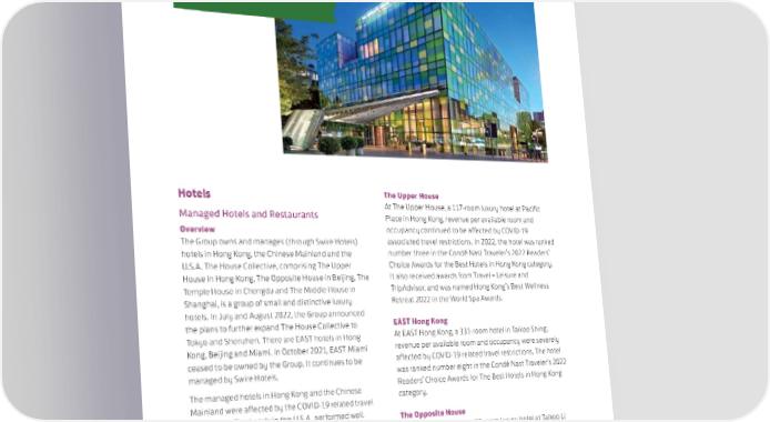 MANAGEMENT DISCUSSION & ANALYSIS | REVIEW OF OPERATIONS The Opposite House BEIJING Hotels The Upper House Managed Hotels and Restaurants At The Upper House, a 117-room luxury hotel at Pacific Place in Hong Kong, revenue per available room and Overview occupancy continued to be affected by COVID-19 The Group owns and manages (through Swire Hotels) associated travel restrictions. In 2022, the hotel was ranked hotels in Hong Kong, the Chinese Mainland and the number three in the Condé Nast Traveler’s 2022 Readers’ U.S.A. The House Collective, comprising The Upper Choice Awards for the Best Hotels in Hong Kong category. House in Hong Kong, The Opposite House in Beijing, The It also received awards from Travel + Leisure and Temple House in Chengdu and The Middle House in TripAdvisor, and was named Hong Kong’s Best Wellness Shanghai, is a group of small and distinctive luxury Retreat 2022 in the World Spa Awards. hotels. In July and August 2022, the Group announced the plans to further expand The House Collective to EAST Hong Kong Tokyo and Shenzhen. There are EAST hotels in Hong At EAST Hong Kong, a 331-room hotel in Taikoo Shing, Kong, Beijing and Miami. In October 2021, EAST Miami revenue per available room and occupancy were severely ceased to be owned by the Group. It continues to be affected by COVID-19 related travel restrictions. The hotel managed by Swire Hotels. was ranked number eight in the Condé Nast Traveler’s 2022 The managed hotels in Hong Kong and the Chinese Readers’ Choice Awards for The Best Hotels in Hong Kong Mainland were affected by the COVID-19 related travel category. restrictions. The hotels in the U.S.A. performed well. The Opposite House The managed hotels (including restaurants and taking The Opposite House is a 99-room luxury hotel at Taikoo Li account of central costs) recorded an operating loss Sanlitun, Beijing. Its occupancy and revenue per available before depreciation of HK$118 million in 2022, room declined in 2022 due to COVID-19 associated compared with an operating profit before depreciation restrictions. In 2022, the hotel received awards from Condé of HK$22 million in 2021. Nast Traveler and Travel + Leisure, and was ranked number five and six in TripAdvisor’s Top 25 Hotels and Luxury Hotels in China respectively. Jing Yaa Tang restaurant was awarded with 1-star in the MICHELIN Guide Beijing 2022. 60