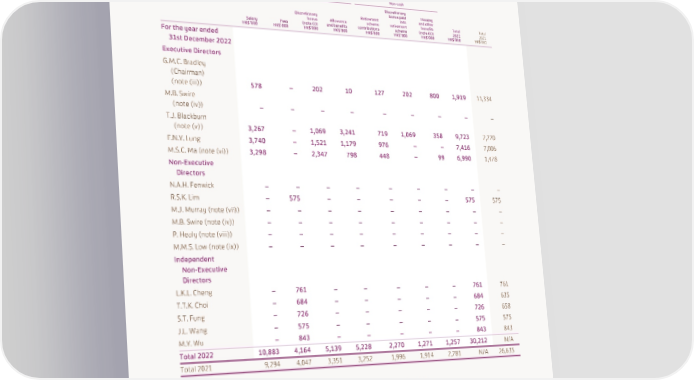 9. Directors’ and Executive Officers’ Emoluments (a) The total emoluments of Directors of the Company disclosed pursuant to section 383 (1) of the Hong Kong Companies Ordinance and the Companies (Disclosure of Information about Benefits of Directors) Regulation are as follows: Cash Non-cash Discretionary bonus paid Housing Discretionary Retirement into and other bonus Allowance scheme retirement benefits Total Total Salary Fees (note (i)) and benefits contributions scheme (note (ii)) 2022 2021 HK$’000 HK$’000 HK$’000 HK$’000 HK$’000 HK$’000 HK$’000 HK$’000 HK$’000 For the year ended 31st December 2022 Executive Directors G.M.C. Bradley (Chairman) (note (iii)) 578 – 202 10 127 202 800 1,919 11,334 M.B. Swire (note (iv)) – – – – – – – – – T.J. Blackburn (note (v)) 3,267 – 1,069 3,241 719 1,069 358 9,723 2,770 F.N.Y. Lung 3,740 – 1,521 1,179 976 – – 7,416 7,006 M.S.C. Ma (note (vi)) 3,298 – 2,347 798 448 – 99 6,990 1,478 Non-Executive Directors N.A.H. Fenwick – – – – – – – – – R.S.K. Lim – 575 – – – – – 575 575 M.J. Murray (note (vii)) – – – – – – – – – M.B. Swire (note (iv)) – – – – – – – – – P. Healy (note (viii)) – – – – – – – – – M.M.S. Low (note (ix)) – – – – – – – – – Independent Non-Executive Directors L.K.L. Cheng – 761 – – – – – 761 761 T.T.K. Choi – 684 – – – – – 684 635 S.T. Fung – 726 – – – – – 726 658 J.L. Wang – 575 – – – – – 575 575 M.Y. Wu – 843 – – – – – 843 843 Total 2022 10,883 4,164 5,139 5,228 2,270 1,271 1,257 30,212 N/A Total 2021 9,294 4,047 3,351 3,252 1,996 1,914 2,781 N/A 26,635 Notes: (i) The bonuses disclosed above are related to services as Executive Directors for the previous year. (ii) Other benefits include medical and insurance benefits and overseas tax subsidies. (iii) G.M.C. Bradley was Chief Executive until 24th August 2021 and was elected as Chairman with effect from 25th August 2021. (iv) M.B. Swire was Chairman and an Executive Director until 24th August 2021 and was re-designated as a Non-Executive Director with effect from 25th August 2021. (v) T.J. Blackburn was appointed as an Executive Director and became Chief Executive with effect from 25th August 2021. (vi) M.S.C. Ma was appointed as an Executive Director on 25th August 2021. (vii) M.J. Murray was appointed as a Non-Executive Director on 1st April 2021. (viii) P. Healy resigned as a Non-Executive Director on 24th August 2021. (ix) M.M.S. Low resigned as a Non-Executive Director on 31st March 2021. SWIRE PROPERTIES ANNUAL REPORT 2022 151