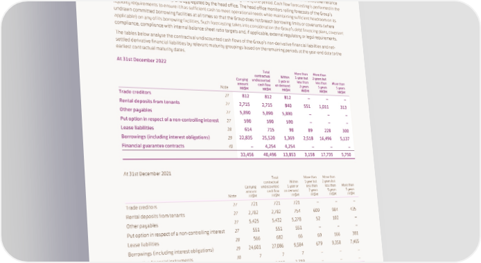NOTES TO THE FINANCIAL STATEMENTS 2. Financial Risk Management (continued) (iv) Liquidity exposure The Group takes liquidity risk into consideration when deciding its sources of funds and their tenors, so as to avoid over reliance on funds from any one source and to prevent substantial refinancing in any one period. Cash flow forecasting is performed in the operating entities of the Group and aggregated by the head office. The head office monitors rolling forecasts of the Group’s liquidity requirements to ensure it has sufficient cash to meet operational needs while maintaining sufficient headroom on its undrawn committed borrowing facilities at all times so that the Group does not breach borrowing limits or covenants (where applicable) on any of its borrowing facilities. Such forecasting takes into consideration the Group’s debt financing plans, covenant compliance, compliance with internal balance sheet ratio targets and, if applicable, external regulatory or legal requirements. The tables below analyse the contractual undiscounted cash flows of the Group’s non-derivative financial liabilities and net- settled derivative financial liabilities by relevant maturity groupings based on the remaining periods at the year-end date to the earliest contractual maturity dates. At 31st December 2022 Total More than More than contractual Within 1 year but 2 years but Carrying undiscounted 1 year or less than less than More than Note amount cash flow on demand 2 years 5 years 5 years HK$M HK$M HK$M HK$M HK$M HK$M Trade creditors 27 812 812 812 – – – Rental deposits from tenants 27 2,715 2,715 840 551 1,011 313 Other payables 27 5,890 5,890 5,890 – – – Put option in respect of a non-controlling interest 27 590 590 590 – – – Lease liabilities 28 614 715 98 89 228 300 Borrowings (including interest obligations) 29 22,835 25,520 1,369 2,518 16,496 5,137 Financial guarantee contracts 40 – 4,254 4,254 – – – 33,456 40,496 13,853 3,158 17,735 5,750 At 31st December 2021 Total More than More than contractual Within 1 year but 2 years but Carrying undiscounted 1 year or less than less than More than Note amount cash flow on demand 2 years 5 years 5 years HK$M HK$M HK$M HK$M HK$M HK$M Trade creditors 27 721 721 721 – – – Rental deposits from tenants 27 2,782 2,782 754 609 984 435 Other payables 27 5,425 5,432 5,278 52 102 – Put option in respect of a non-controlling interest 27 551 551 551 – – – Lease liabilities 28 566 682 66 69 166 381 Borrowings (including interest obligations) 29 24,601 27,086 9,584 679 9,358 7,465 Derivative financial instruments 30 7 7 7 – – – Financial guarantee contracts 40 – 3,719 3,719 – – – 34,653 40,980 20,680 1,409 10,610 8,281 144