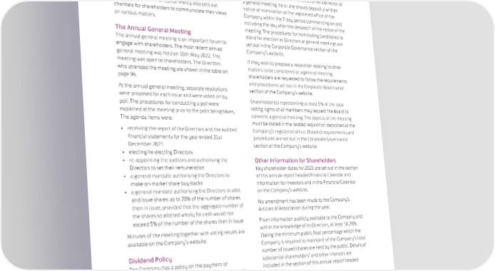 Shareholders may send their enquiries and concerns Shareholder Engagement to the Board by post or email at ir@swireproperties. Pursuant to Article 95 of the Company’s Articles of com. The relevant contact details are set out in the Association, if a shareholder wishes to propose a person Financial Calendar and Information for Investors other than a retiring Director for election as a Director at section of this annual report. The Company’s a general meeting, he or she should deposit a written Shareholders’ Communication Policy also sets out notice of nomination at the registered office of the channels for shareholders to communicate their views Company within the 7-day period commencing on and on various matters. including the day after the despatch of the notice of the The Annual General Meeting meeting. The procedures for nominating candidates to stand for election as Directors at general meetings are The annual general meeting is an important forum to set out in the Corporate Governance section of the engage with shareholders. The most recent annual Company’s website. general meeting was held on 10th May 2022. The If they wish to propose a resolution relating to other meeting was open to shareholders. The Directors matters to be considered at a general meeting, who attended the meeting are shown in the table on shareholders are requested to follow the requirements page 96. and procedures set out in the Corporate Governance At the annual general meeting, separate resolutions section of the Company’s website. were proposed for each issue and were voted on by Shareholder(s) representing at least 5% of the total poll. The procedures for conducting a poll were voting rights of all members may request the Board to explained at the meeting prior to the polls being taken. convene a general meeting. The objects of the meeting The agenda items were: must be stated in the related requisition deposited at the • receiving the report of the Directors and the audited Company’s registered office. Detailed requirements and financial statements for the year ended 31st procedures are set out in the Corporate Governance December 2021 section of the Company’s website. • electing/re-electing Directors • re-appointing the auditors and authorising the Other Information for Shareholders Directors to set their remuneration Key shareholder dates for 2023 are set out in the section • a general mandate authorising the Directors to of this annual report headed Financial Calendar and make on-market share buy-backs Information for Investors and in the Financial Calendar • a general mandate authorising the Directors to allot on the Company’s website. and issue shares up to 20% of the number of shares No amendment has been made to the Company’s then in issue, provided that the aggregate number of Articles of Association during the year. the shares so allotted wholly for cash would not exceed 5% of the number of the shares then in issue From information publicly available to the Company and Minutes of the meeting together with voting results are within the knowledge of its Directors, at least 10.28% available on the Company’s website. (being the minimum public float percentage which the Company is required to maintain) of the Company’s total Dividend Policy number of issued shares are held by the public. Details of The Company has a policy on the payment of substantial shareholders’ and other interests are dividends, which is set out in the section of this annual included in the section of this annual report headed report headed Directors’ Report. Directors’ Report. 107 SWIRE PROPERTIES ANNUAL REPORT 2022