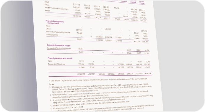SCHEDULE OF PRINCIPAL GROUP PROPERTIES At 31st December 2022 Gross floor areas in square feet Hong Kong Chinese Mainland U.S.A. and Elsewhere Totals Held through Held through Held through Held through subsidiaries Held through other Held through other Held through other Held through and other subsidiaries companies subsidiaries companies subsidiaries companies subsidiaries companies Completed properties for investment Retail 2,321,585 223,903 3,239,776 2,534,983 496,508 – 6,057,869 8,816,755 Office 8,474,662 738,548 1,693,125 1,208,566 – – 10,167,787 12,114,901 Residential/Serviced apartment 555,551 – 50,376 143,059 – – 605,927 748,986 Hotels 358,371 435,770 678,897 498,603 – 258,750 1,037,268 2,230,391 11,710,169 1,398,221 5,662,174 4,385,211 496,508 258,750 17,868,851 23,911,033 Property developments for investment Retail – – – 1,071,720 – – – 1,071,720 Office 223,303 – – – – – 223,303 223,303 Residential/Serviced apartment 14,768 – – – – – 14,768 14,768 Under planning – – 2,364,668 1,415,930 1,510,000* – 3,874,668 5,290,598 238,071 – 2,364,668 2,487,650 1,510,000 – 4,112,739 6,600,389 Completed properties for sale Residential/Serviced apartment 10,817 – – – – 50,611 10,817 61,428 10,817 – – – – 50,611 10,817 61,428 Property developments for sale Retail 15,199 – – – – – 15,199 15,199 Residential/Mixed-use 795,266 159,576 – – 1,073,000 1,683,168 1,868,266 3,711,010 810,465 159,576 – – 1,073,000 1,683,168 1,883,465 3,726,209 12,769,522 1,557,797 8,026,842 6,872,861 3,079,508 1,992,529 23,875,872 34,299,059 * One Brickell City Centre is currently under planning. The site is included under “Properties held for development” in the financial statements. Notes: 1. All properties held through subsidiary companies are wholly-owned except for Island Place (60% owned), Chai Wan Inland Lot No. 178 (80% owned), Taikoo Hui, Guangzhou (97% owned), Taikoo Li Xi’an (70% owned) and Brickell City Centre (Retail: 62.93% owned). The above summary table includes the floor areas of these five properties in 100%. 2. “Other companies” comprise joint venture, associated companies and financial assets at fair value through profit or loss. The floor areas of properties held through such companies are shown on an attributable basis. 3. Gross floor areas in Hong Kong and the Chinese Mainland exclude car parking spaces; there are about 9,840 completed car parking spaces in Hong Kong and the Chinese Mainland, which are held by subsidiaries and other companies for investment. 4. When a Hong Kong property is held under a renewable lease, the expiry date of the renewal period is shown. 5. All properties in the U.S.A. are freehold. 6. Gross floor areas for all properties in the U.S.A. represent saleable or leasable areas for completed and nearly completed properties, which exclude car parking spaces; there are about 1,976 completed car parking spaces held by subsidiaries and other companies for investment. 204