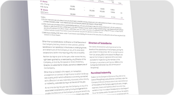 Percentage Capacity of Voting Shares Beneficial Interest (comprised Trust Total No. in the class) Personal Family Interest of Shares (%) Note Swire Pacific Limited ‘A’ shares L.K.L. Cheng 10,000 – – 10,000 0.0012 M.B. Swire 180,000 – 301,000 481,000 0.0556 (3) ‘B’ shares M.B. Swire 390,000 – 3,024,617 3,414,617 0.1161 (2) Notes: (1) N.A.H. Fenwick was a trustee of a trust which held 3,136,000 ordinary shares and 2,822,400 preference shares in John Swire & Sons Limited included under Trust interest and did not have any beneficial interest in those shares. (2) M.B. Swire was a trustee and/or a potential beneficiary of trusts which held 3,246,624 ordinary shares and 1,691,961 preference shares in John Swire & Sons Limited and 1,225,395 ‘B’ shares in Swire Pacific Limited included under Trust interest and did not have any beneficial interest in those shares. M.B. Swire was one of the executors of a will which held 1,799,222 ‘B’ shares in Swire Pacific Limited included under Trust interest and did not have any beneficial interest in those shares. (3) All shares held by M.B. Swire under Trust interest were held by him as one of the executors of a will and he did not have any beneficial interest in those shares. Other than as stated above, no Director or Chief Executive of Directors of Subsidiaries the Company had any interest or short position, whether The names of all directors who have served on the beneficial or non-beneficial, in the shares or underlying shares boards of the subsidiaries of the Company during the and debentures of the Company or any of its associated year ended 31st December 2022 or during the period corporations (within the meaning of Part XV of the SFO). from 1st January 2023 to the date of this Report are Neither during nor prior to the year under review has any kept at the Company’s registered office and made right been granted to, or exercised by, any Director of the available for inspection by the members of the Company, or to or by the spouse or minor child of any Company in accordance with Section 390(6) of the Director, to subscribe for shares, warrants or debentures of Companies Ordinance (Cap. 622 of the Laws of the Company. Hong Kong). Other than as stated in this report, no transaction, Permitted Indemnity arrangement or contract of significance to which the Group was a party and in which a Director or an entity connected Subject to the Companies Ordinance (Cap. 622 of the with a Director is or was materially interested, either directly Laws of Hong Kong), every Director is entitled under the or indirectly, subsisted during or at the end of the year. Company’s Articles of Association to be indemnified out At no time during the year was the Company, or any of its of the assets of the Company against all costs, charges, associated corporations, a party to any arrangements to expenses, losses and liabilities which he or she may enable the Directors of the Company to acquire benefits by sustain or incur in or about the execution or discharge of means of the acquisition of shares in or debentures of the his or her duties and/or the exercise of his or her powers Company or any other body corporate. and/or otherwise in relation to or in connection with his or her duties, powers or office. To the extent permitted Directors’ Interests in Competing by such Ordinance, the Company has taken out Businesses insurance against the liability and costs associated with defending any proceedings which may be brought None of the Directors or their respective close associates against directors of companies in the Group. has any competing interests which need to be disclosed pursuant to Rule 8.10 of the Listing Rules. 117 SWIRE PROPERTIES ANNUAL REPORT 2022