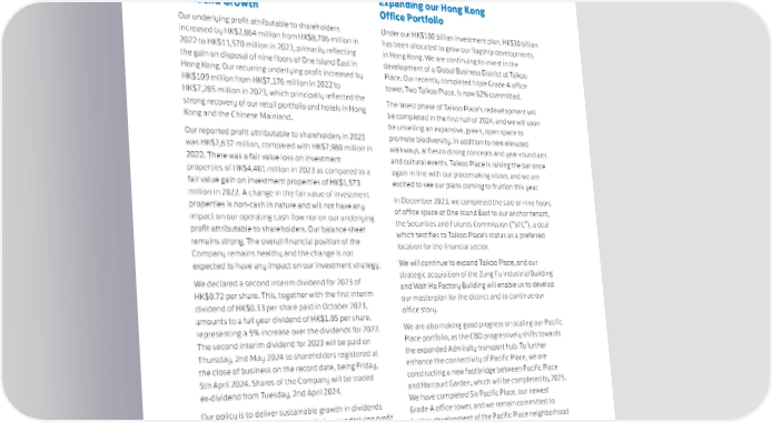 SWIRE PROPERTIES ANNUAL REPORT 2023 Profits and Sustained Expanding our Hong Kong Dividend Growth Office Portfolio Our underlying profit attributable to shareholders Under our HK$100 billion investment plan, HK$30 billion increased by HK$2,864 million from HK$8,706 million in has been allocated to grow our flagship developments 2022 to HK$11,570 million in 2023, primarily reflecting in Hong Kong. We are continuing to invest in the the gain on disposal of nine floors of One Island East in development of a Global Business District at Taikoo Hong Kong. Our recurring underlying profit increased by Place. Our recently completed triple Grade-A office HK$109 million from HK$7,176 million in 2022 to tower, Two Taikoo Place, is now 62% committed. HK$7,285 million in 2023, which principally reflected the The latest phase of Taikoo Place’s redevelopment will strong recovery of our retail portfolio and hotels in Hong be completed in the first half of 2024, and we will soon Kong and the Chinese Mainland. be unveiling an expansive, green, open space to Our reported profit attributable to shareholders in 2023 promote biodiversity, in addition to new elevated was HK$2,637 million, compared with HK$7,980 million in walkways, al fresco dining concepts and year-round arts 2022. There was a fair value loss on investment and cultural events. Taikoo Place is raising the bar once properties of HK$4,401 million in 2023 as compared to a again in line with our placemaking vision, and we are fair value gain on investment properties of HK$1,573 excited to see our plans coming to fruition this year. million in 2022. A change in the fair value of investment In December 2023, we completed the sale of nine floors properties is non-cash in nature and will not have any of office space at One Island East to our anchor tenant, impact on our operating cash flow nor on our underlying the Securities and Futures Commission (“SFC”), a deal profit attributable to shareholders. Our balance sheet which testifies to Taikoo Place’s status as a preferred remains strong. The overall financial position of the location for the financial sector. Company remains healthy and the change is not expected to have any impact on our investment strategy. We will continue to expand Taikoo Place, and our We declared a second interim dividend for 2023 of strategic acquisition of the Zung Fu Industrial Building HK$0.72 per share. This, together with the first interim and Wah Ha Factory Building will enable us to develop dividend of HK$0.33 per share paid in October 2023, our masterplan for the district and to continue our amounts to a full year dividend of HK$1.05 per share, office story. representing a 5% increase over the dividends for 2022. We are also making good progress on scaling our Pacific The second interim dividend for 2023 will be paid on Place portfolio, as the CBD progressively shifts towards Thursday, 2nd May 2024 to shareholders registered at the expanded Admiralty transport hub. To further the close of business on the record date, being Friday, enhance the connectivity of Pacific Place, we are 5th April 2024. Shares of the Company will be traded constructing a new footbridge between Pacific Place ex-dividend from Tuesday, 2nd April 2024. and Harcourt Garden, which will be completed by 2025. Our policy is to deliver sustainable growth in dividends We have completed Six Pacific Place, our newest and to pay out approximately half of our underlying profit Grade-A office tower, and we remain committed to in ordinary dividends over time. With the benefit of our further development of the Pacific Place neighborhood planned investments, we aim to deliver mid-single digit in the future. annual growth in dividends. 17