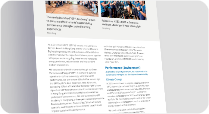 CORPORATE GOVERNANCE & SUSTAINABILITY SUSTAINABLE DEVELOPMENT The newly launched “GPP Academy” aimed Raised over HK$310,000 at Corporate to enhance office tenants’ sustainability Wellness Challenge: 8-Hour Charity Spin performance through curated learning Hong Kong experiences Hong Kong As at December 2023, 107 F&B tenants received Green and indoor golf. More than 550 office executives from Kitchen Awards in Hong Kong and the Chinese Mainland. 12 tenant companies took part in the “Corporate By installing energy-efficient and water-efficient kitchen Wellness Challenge: 8-Hour Charity Spin”. The event appliances and well-designed ventilation systems together raised over HK$310,000 for the InspiringHK Sports with proper waste recycling, these tenants have saved Foundation, of which HK$150,000 was donated by energy and water, reduced waste and improved the Swire Properties. kitchen environment. Performance (Environment) We collaborate with office tenants through our Green As a leading property developer, we are committed to Performance Pledge (“GPP”) in terms of fit-out and building and managing our developments sustainably. operations – to improve energy, water and waste performance. We aim to have 50% of office tenants sign Climate Change the GPP by 2025. As at December 2023, 90 tenants, In 2023, we continued to progress steadily towards our occupying 41% of office lettable floor area (“LFA”), have 1.5°C-aligned science-based targets, as part of our core signed up. GPP Award Presentation Ceremonies were held strategy to reach net-zero emissions by 2050. This year, in Hong Kong and the Chinese Mainland to celebrate we achieved a 29% absolute Scope 1 and 2 carbon participants’ achievements. We also launched the GPP reduction compared to the 2019 baseline for our global Academy in Hong Kong, a three-year collaboration with the portfolio. We continued to adopt innovative low-carbon Business Environment Council (“BEC”) that will feature technologies and management practices and invest in quarterly workshops to enhance tenants’ capabilities to energy research and development. improve sustainability performance. PROJECT AFTER 6 We continue to adopt a whole-lifecycle carbon management approach at our developments, We hosted eleven musicals for over 900 footfalls, including including the Company’s latest project, Taikoo Li Xi’an. tenants’ staff; and attracted over 8,000 footfalls during The project will employ low carbon construction 14 live music performances. materials and low-carbon energy use strategies to reduce emissions from construction to operations. Workout x Lunch Notably, the electrification of the space heating Over 200 participants from 59 tenant companies at Taikoo system and use of a low-carbon ground source heat Place took part in the fitness workshops which offered high pump system can provide up to 60% of the project’s intensity full-body workouts, core training, yoga, stretching annual heating demand. 132