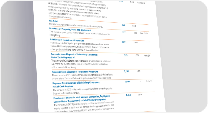SWIRE PROPERTIES ANNUAL REPORT 2023 Consolidated Statement of Cash Flows 2023 2022 HK$M HK$M Reference Cash Generated from Operations 7,492 6,332 Note 41(a) Cash generated from operations of HK$7,492 million principally comprised cash inflows from property investment of approximately HK$9,935 million and from property trading of approximately HK$213 million, partly offset by operating expenses of approximately HK$1,527 million and expenditure on properties for sale of approximately HK$583 million (after netting off contribution from a non-controlling interest). Tax Paid 963 1,127 The decrease principally reflected less tax paid in Hong Kong. Purchase of Property, Plant and Equipment 217 133 Note 41(b) The increase principally reflected additions of plant and equipment in Hong Kong. Additions of Investment Properties 2,771 7,096 The amount in 2023 principally reflected capital expenditure on the Taikoo Place redevelopment, Six Pacific Place, Taikoo Li Xi’an and on other projects in Hong Kong and the Chinese Mainland. Proceeds from Disposal of Subsidiary Companies, 535 1,060 Note 24 Net of Cash Disposed of The amount in 2023 reflected the receipt of settlement of a deferred payment for the sale of the Group’s interest in the Cityplaza One office tower in Hong Kong. Proceeds from Disposal of Investment Properties 5,291 609 The amount in 2023 reflected the proceeds from disposal of nine floors in One Island East and Taikoo Shing car parking spaces in Hong Kong. Payment for Acquisition of Subsidiary Companies, 3,699 – Note 43 Net of Cash Acquired The amount in 2023 reflected the acquisition of the remaining equity interest in Taikoo Li Chengdu. Purchase of Shares in Joint Venture Companies, Equity and 2,316 2,034 Loans (Net of Repayment) to Joint Venture Companies The amount in 2023 principally reflected the purchase of shares and equity injected in joint venture companies in aggregate of HK$1,147 million and net movements of loans with joint venture companies of HK$1,169 million. Equity and Loans (Net of Repayment) to Associated Companies 10,380 52 The amount in 2023 principally reflected the purchase of shares in associated companies. Loans Drawn and Refinanced, and Bonds Issued 15,053 (1,838) (Net of Repayment of Loans, Bonds and Lease Liabilities) The amount in 2023 principally reflected the drawdown of bank loans and the issue of medium term notes in Hong Kong, partly offset by repayment of loans. 79