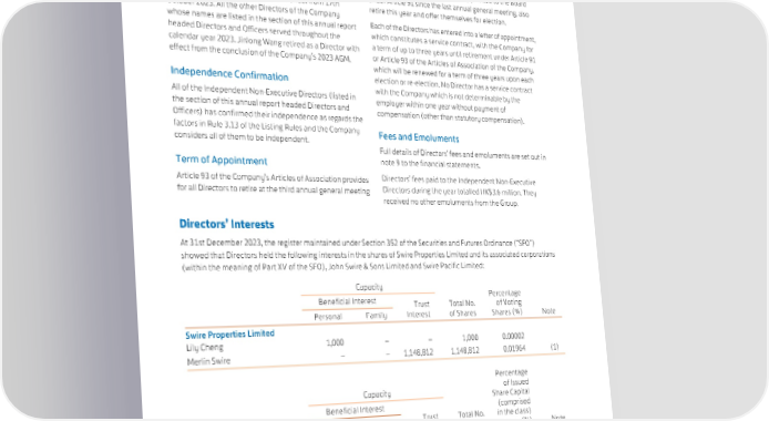 CORPORATE GOVERNANCE & SUSTAINABILITY DIRECTORS’ REPORT Directors following their election by ordinary resolution. In accordance Angela Zhu was appointed as a Director with effect from therewith, Fanny Lung and Martin Murray retire this year the conclusion of the Company’s 2023 annual general and, being eligible, offer themselves for re-election. Richard meeting held on 9th May 2023 (“2023 AGM”) and Richard Sell and Angela Zhu, having been appointed to the Board Sell was appointed as a Director with effect from 17th under Article 91 since the last annual general meeting, also October 2023. All the other Directors of the Company retire this year and offer themselves for election. whose names are listed in the section of this annual report Each of the Directors has entered into a letter of appointment, headed Directors and Officers served throughout the which constitutes a service contract, with the Company for calendar year 2023. Jinlong Wang retired as a Director with a term of up to three years until retirement under Article 91 effect from the conclusion of the Company’s 2023 AGM. or Article 93 of the Articles of Association of the Company, which will be renewed for a term of three years upon each Independence Confirmation election or re-election. No Director has a service contract All of the Independent Non-Executive Directors (listed in with the Company which is not determinable by the the section of this annual report headed Directors and employer within one year without payment of Officers) has confirmed their independence as regards the compensation (other than statutory compensation). factors in Rule 3.13 of the Listing Rules and the Company Fees and Emoluments considers all of them to be independent. Full details of Directors’ fees and emoluments are set out in Term of Appointment note 9 to the financial statements. Article 93 of the Company’s Articles of Association provides Directors’ fees paid to the Independent Non-Executive for all Directors to retire at the third annual general meeting Directors during the year totalled HK$3.6 million. They received no other emoluments from the Group. Directors’ Interests At 31st December 2023, the register maintained under Section 352 of the Securities and Futures Ordinance (“SFO”) showed that Directors held the following interests in the shares of Swire Properties Limited and its associated corporations (within the meaning of Part XV of the SFO), John Swire & Sons Limited and Swire Pacific Limited: Capacity Percentage Beneficial Interest Trust Total No. of Voting Personal Family Interest of Shares Shares (%) Note Swire Properties Limited Lily Cheng 1,000 – – 1,000 0.00002 Merlin Swire – – 1,148,812 1,148,812 0.01964 (1) Percentage Capacity of Issued Beneficial Interest Share Capital (comprised Trust Total No. in the class) Personal Family Interest of Shares (%) Note John Swire & Sons Limited Ordinary Shares of £1 Adam Fenwick – – 3,136,000 3,136,000 3.14 (2) Merlin Swire 2,193,550 630,000 20,175,819 22,999,369 23.00 (3) 8% Cum. Preference Shares of £1 Adam Fenwick – – 2,822,400 2,822,400 3.14 (2) Merlin Swire 3,966,125 – 16,917,930 20,884,055 23.20 (3) 122