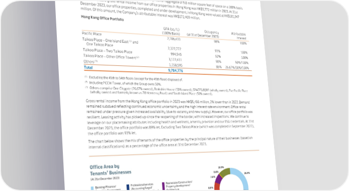 SWIRE PROPERTIES ANNUAL REPORT 2023 Investment Properties – Hong Kong Offices Overview The completed office portfolio in Hong Kong comprises an aggregate of 9.8 million square feet of space on a 100% basis. Total attributable gross rental income from our office properties in Hong Kong was HK$5,772 million in 2023. At 31st December 2023, our office properties, completed and under development, in Hong Kong were valued at HK$181,947 million. Of this amount, the Company’s attributable interest was HK$172,469 million. Hong Kong Office Portfolio GFA (sq. ft.) Occupancy Attributable (100% Basis) (at 31st December 2023) Interest Pacific Place 2,186,433 98% 100% (1) and Taikoo Place – One Island East One Taikoo Place 2,322,772 93% 100% Taikoo Place – Two Taikoo Place 994,545 62% 100% (2) 3,122,431 90% 50%/100% Taikoo Place – Other Office Towers (3) 1,158,595 86% 26.67%/50%/100% Others Total 9,784,776 (1) Excluding the 45th to 54th floors (except for the 49th floor) disposed of. (2) Including PCCW Tower, of which the Group owns 50%. (3) Others comprise One Citygate (26.67% owned), Berkshire House (50% owned), SPACES.8QRE (wholly-owned), Five Pacific Place (wholly-owned and formerly known as 28 Hennessy Road) and South Island Place (50% owned). Gross rental income from the Hong Kong office portfolio in 2023 was HK$5,466 million, 2% lower than in 2022. Demand remained subdued reflecting continued economic uncertainty and the high interest rate environment. Office rental remained under pressure given increased availability (due to vacancy and new supply). However, our office portfolio was resilient. Leasing activity has picked up since the reopening of the border, with increased inspections. We continue to leverage on our placemaking attributes including health and wellness, amenity provision and our ESG credentials. At 31st December 2023, the office portfolio was 89% let. Excluding Two Taikoo Place (which was completed in September 2022), the office portfolio was 93% let. The chart below shows the mix of tenants of the office properties by the principal nature of their businesses (based on internal classifications) as a percentage of the office area at 31st December 2023. Office Area by Tenants’ Businesses 10.9% (At 31st December 2023) 0.6% 7.6% 26.9% Banking/Finance/ Professional services Real estate/Construction/ Securities/Investment (Accounting/Legal/ Property development/ Management consulting/ Architecture 8.8% Trading Corporate secretarial) Advertising and Insurance public relations Others 9.9% Technology/ 19.5% Media/Telecoms 15.8% 37