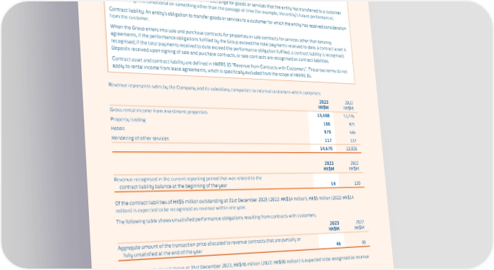 SWIRE PROPERTIES ANNUAL REPORT 2023 4. Revenue (continued) Accounting Policy (continued) Definition of terms Contract asset: An entity’s right to consideration in exchange for goods or services that the entity has transferred to a customer when that right is conditional on something other than the passage of time (for example, the entity’s future performance). Contract liability: An entity’s obligation to transfer goods or services to a customer for which the entity has received consideration from the customer. When the Group enters into sale and purchase contracts for properties or sale contracts for services other than tenancy agreements, if the performance obligations fulfilled by the Group exceed the total payments received to date, a contract asset is recognised; if the total payments received to date exceed the performance obligation fulfilled, a contract liability is recognised. Deposits received upon signing of sale and purchase contracts, or sale contracts are recognised as contract liabilities. Contract asset and contract liability are defined in HKFRS 15 “Revenue from Contracts with Customers”. These two terms do not apply to rental income from lease agreements, which is specifically excluded from the scope of HKFRS 15. Revenue represents sales by the Company and its subsidiary companies to external customers which comprises: 2023 2022 HK$M HK$M Gross rental income from investment properties 13,408 12,226 Property trading 166 921 Hotels 979 565 Rendering of other services 117 114 14,670 13,826 2023 2022 HK$M HK$M Revenue recognised in the current reporting period that was related to the contract liability balance at the beginning of the year 14 120 Of the contract liabilities of HK$5 million outstanding at 31st December 2023 (2022: HK$14 million), HK$5 million (2022: HK$14 million) is expected to be recognised as revenue within one year. The following table shows unsatisfied performance obligations resulting from contracts with customers. 2023 2022 HK$M HK$M Aggregate amount of the transaction price allocated to revenue contracts that are partially or fully unsatisfied at the end of the year 46 90 Of the amount disclosed above at 31st December 2023, HK$46 million (2022: HK$90 million) is expected to be recognised as revenue within one year. 153