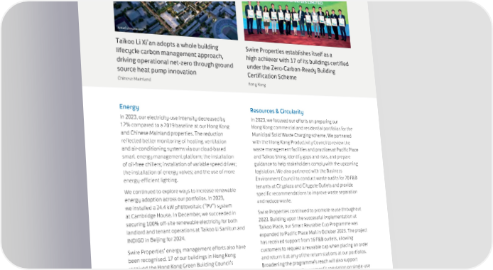 SWIRE PROPERTIES ANNUAL REPORT 2023 Artist’s Impression Taikoo Li Xi’an adopts a whole building Swire Properties establishes itself as a lifecycle carbon management approach, high achiever with 17 of its buildings certified driving operational net-zero through ground under the Zero-Carbon-Ready Building source heat pump innovation Certification Scheme Chinese Mainland Hong Kong Energy Resources & Circularity In 2023, our electricity-use intensity decreased by In 2023, we focused our efforts on preparing our 12% compared to a 2019 baseline at our Hong Kong Hong Kong commercial and residential portfolios for the and Chinese Mainland properties. The reduction Municipal Solid Waste Charging scheme. We partnered reflected better monitoring of heating, ventilation with the Hong Kong Productivity Council to review the and air-conditioning systems via our cloud-based waste management facilities and practices at Pacific Place smart-energy management platform; the installation and Taikoo Shing, identify gaps and risks, and prepare of oil-free chillers; installation of variable speed drives; guidance to help stakeholders comply with the upcoming the installation of energy valves; and the use of more legislation. We also partnered with the Business energy-efficient lighting. Environment Council to conduct waste audits for 20 F&B We continued to explore ways to increase renewable tenants at Cityplaza and Citygate Outlets and provide energy adoption across our portfolios. In 2023, specific recommendations to improve waste separation we installed a 24.4 kW photovoltaic (“PV”) system and reduce waste. at Cambridge House. In December, we succeeded in Swire Properties continued to promote reuse throughout securing 100% off-site renewable electricity for both 2023. Building upon the successful implementation at landlord and tenant operations at Taikoo Li Sanlitun and Taikoo Place, our Smart Reusable Cup Programme was INDIGO in Beijing for 2024. expanded to Pacific Place Mall in October 2023. The project Swire Properties’ energy management efforts also have has received support from 16 F&B outlets, allowing been recognised. 17 of our buildings in Hong Kong customers to request a reusable cup when placing an order received the Hong Kong Green Building Council’s and return it at any of the return stations at our portfolios. newly-launched Zero-Carbon-Ready Building Broadening the programme’s reach will also support Certification, the most received by a developer. Six of preparations for the Government’s regulation on single-use the buildings received a “Super Low” rating on the plastics, which will be implemented on 22 April 2024. Since landlord side, with two of them, One Taikoo Place and the programme’s launch, we have prevented the disposal of Two Pacific Place, receiving a “Super Low” rating in both over 23,000 single-use cups at Taikoo Place and Pacific the landlord and whole building categories. Place collectively. 133